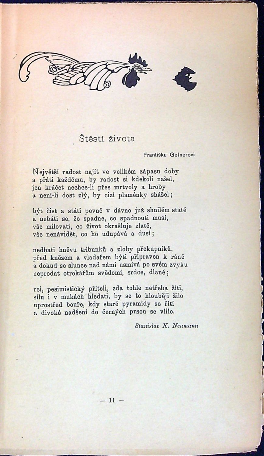 Velmi vzácné první a nezkonfiskované vydání Kalendáře, který vydával a vedl S. K. Neumann (vyšly pouze dva ročníky). Ve zkonfiskovaném vydání, které vyšlo téhož roku byly zkonfiskovány pasáže v Kropotkinově "Anarchistické morálce": na str. 38 poslední odstavec "zákon a náboženství", celé strany 39-41, odstavce na str. 42-44,46,47 týkající se náboženství; od Federica Uralese ve "Volné lásce" celé strany 60, 61 (kromě viněty) a v závěrečném textu od André Veidauxe na str. 83 dva odstavce o socialismu a revolučních prostředcích a celá strana 84 (krom závěrečné viněty) o kosmopolitismu a individualismu. - Původní papírová obálka červeno-černo-bíle tištěná s kresbou Jana Lamanna (= Bořivoje Hnátka) od knižního bloku utržená a při okrajích místy lehce potrhaná, uprostřed nahoře staré neidentifikovatelná vlastnická značka, v ilustraci hnědá skvrna o rozměru cca 1 cm, zadní strana obálky chybí, ve hřbetu chybí při horním i spodním okraji pap. pokryv v délce cca 2 cm. Knižní blok spojený dvěma kovovými sponkami.