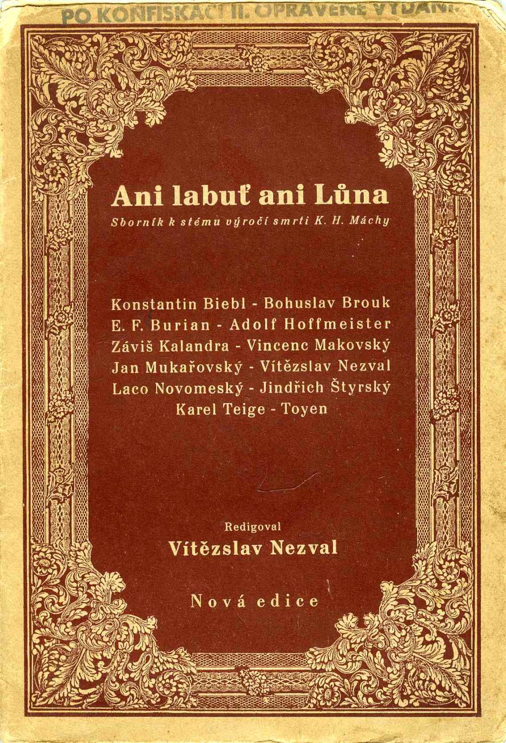 Původní papírová obálka podle návrhu Štýrskýho mírně zašpiněná, na horním okraji její přední strany razítko "Po konfiskaci II. opravené vydání", při vrchním okraji hřbetu chybí 2 cm pokryvu, spodní okraj hřbetu natržený; knižní blok po s. 48 odlepený, oslí uši. - Slavný Máchovský sborník, který ve své době způsobil skandál, část nákladu byla zabavena a příspěvek B. Brouka "Máchův kult" byl z knihy odstraněn, též doslov podepsaný všemi autory sborníku (Biebl, Brouk, E.F. Burian, Hoffmeister, Kalandra, Makovský, Mukařovský, Nezval, Novomeský, Štyrský, Teige, Toyen). Tyto exempláře byly pak označeny razítkem výše zmíněným. V tomto konfiskovaném exempláři chybí zabavený článek Broukův (s. 77-81) a doslov (s. 82-83 - na rubu s tiráží).