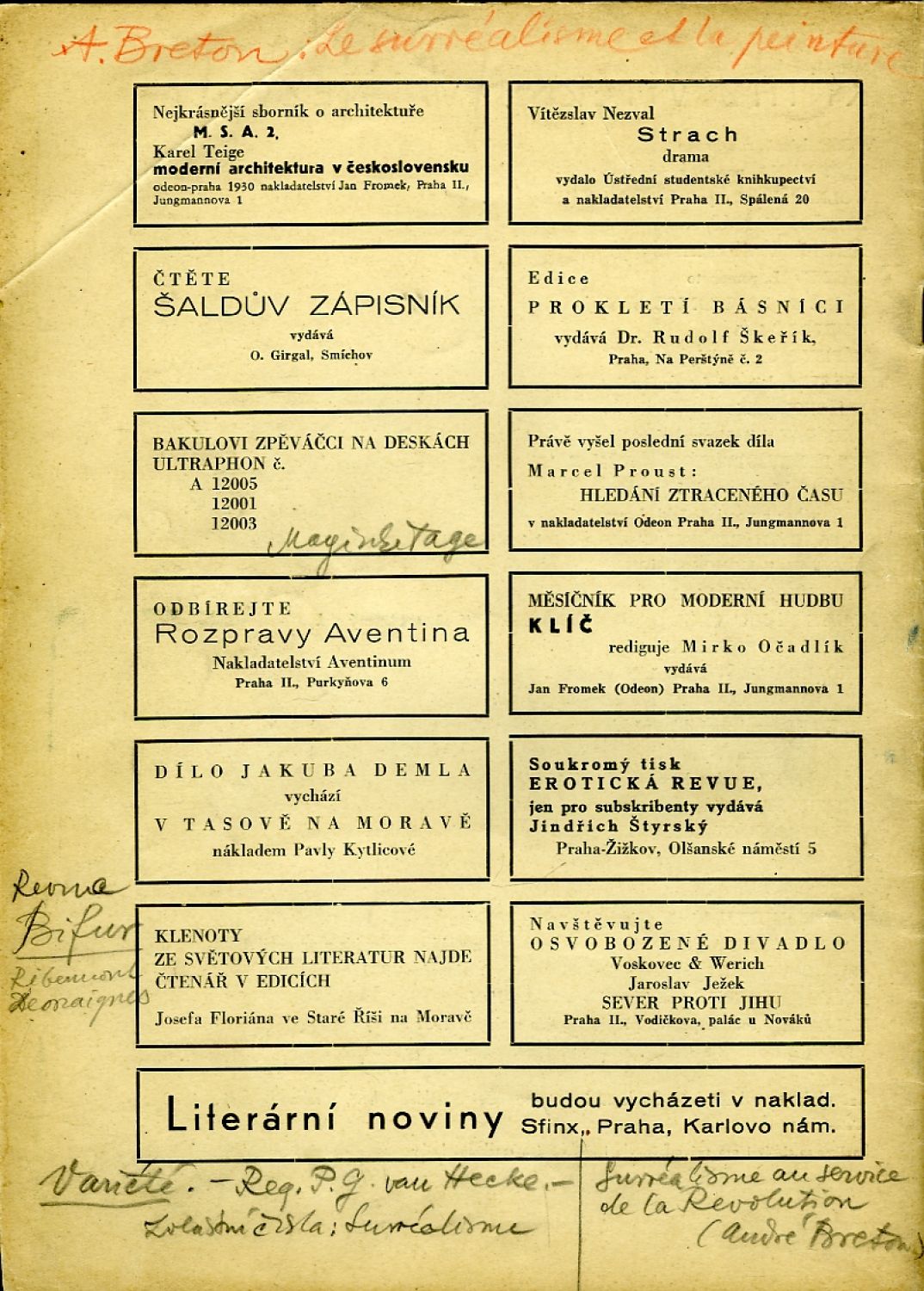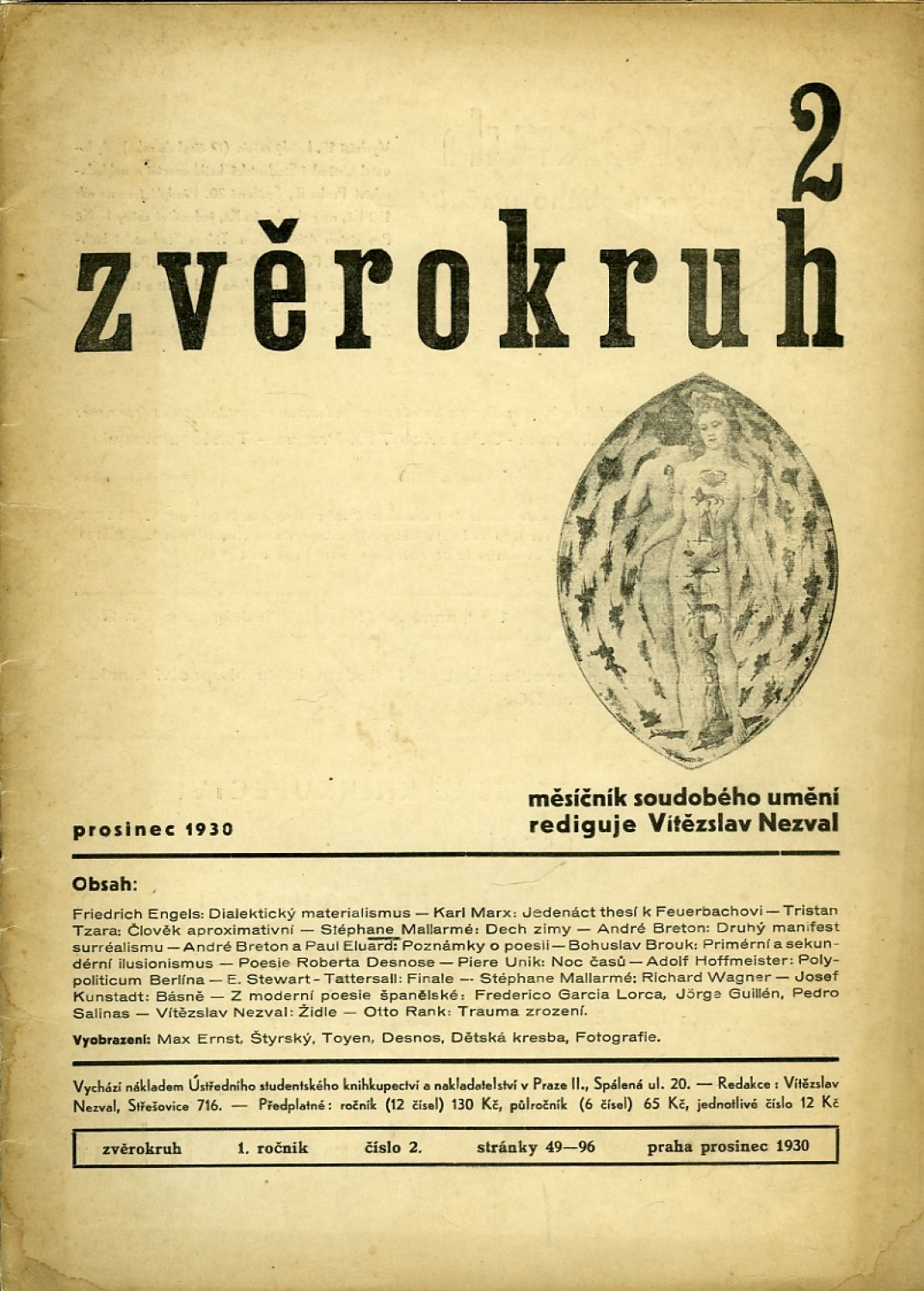 Původní obálky, na obálce prvého čísla mírná světlá skvrna, na zadní straně obálky tužkou a červenou pastelkou poznámky s údaji o důležitých francouzských surrealistických časopisech a knihách, jinak ve stavu velmi dobrém. - Velmi vzácný časopis, který měl původně vycházet jako měsíčník, ale z finančních důvodů vyšla pouze prvá dvě čísla.