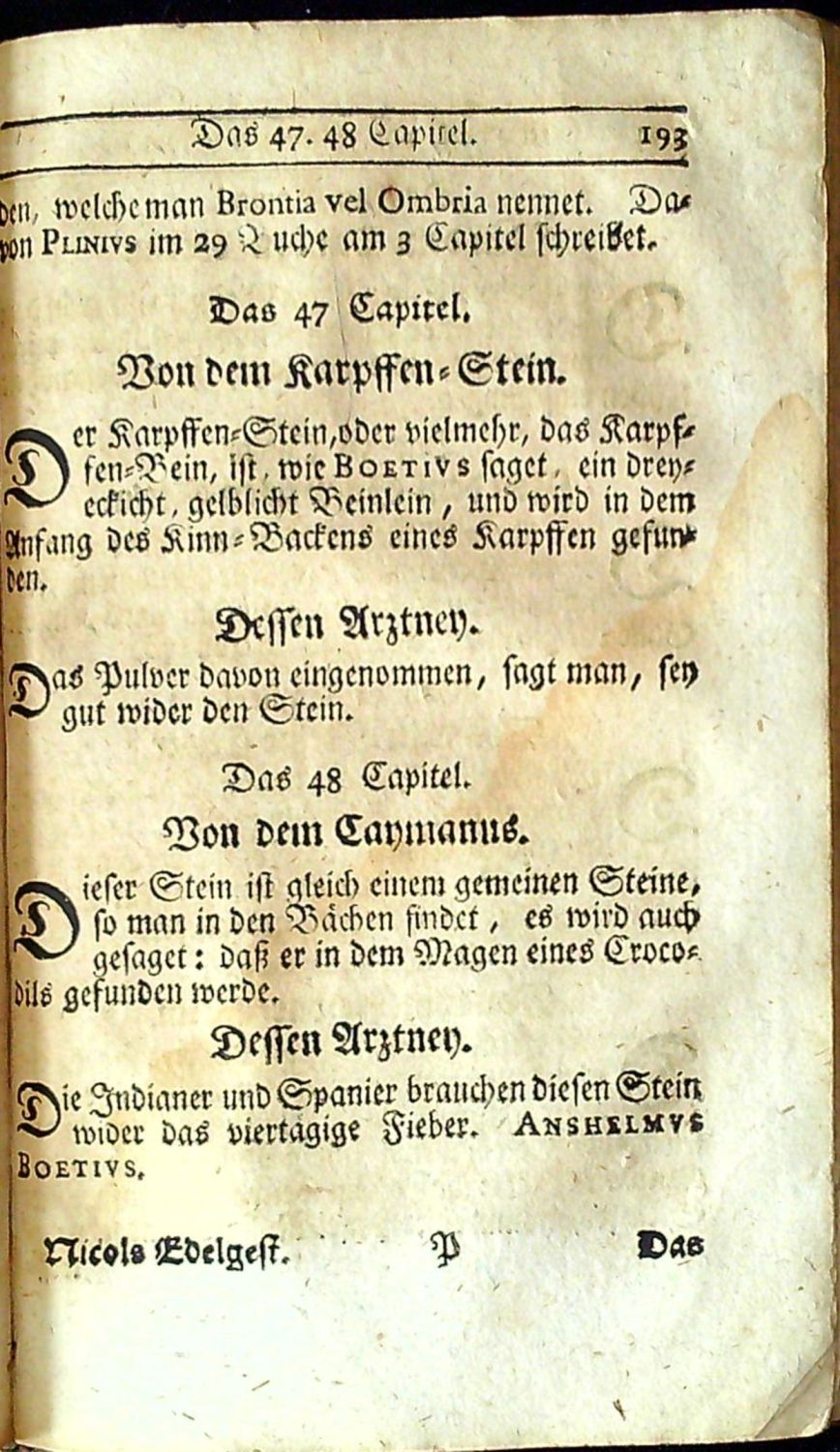Beschreibung der Steine sowol Edel als Gemeine Darinnen derer Gestalt, Kräffte, Tugenden, Medicin/ Eigenschfften, Preisz und Werth auf das Deutlichste gezeiget wird Samt beygesetzen Warnungen sich für derer Verfälschung wohl zu hüten wegen seiner Fürtrefflichkeit aus dem Engelischen ins Teutsche übersetzet durch Johann Langen.