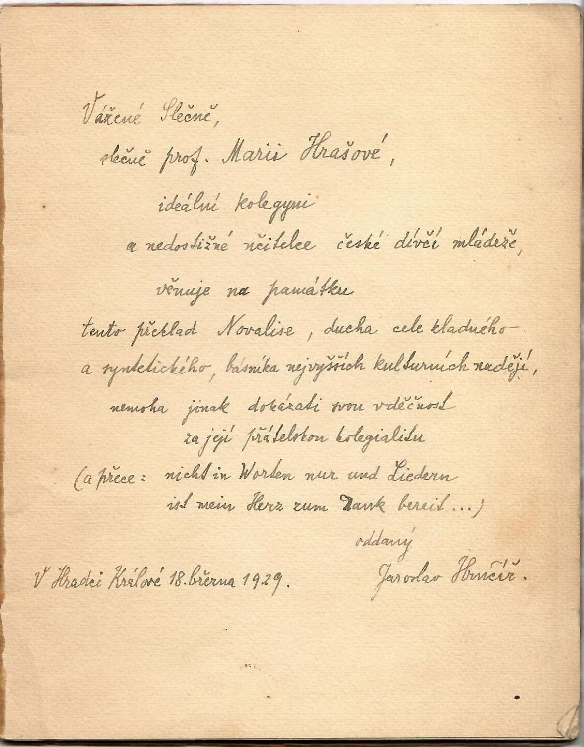 Původní pap. obálka, lehce zašpiněná, papír obálky při vnějším okraji pomačkaný a zkrabatělý, pap. pokryv hřbetu odlepený od knižního bloku. Na přední předsádce rkp. dedikace slečně prof. Marii Hrašové ..." datovaná 18. března 1929 v Hradci Králové od "Jaroslava Hrnčíře". Spodní roh posledního nepotištěného listu přeložený.