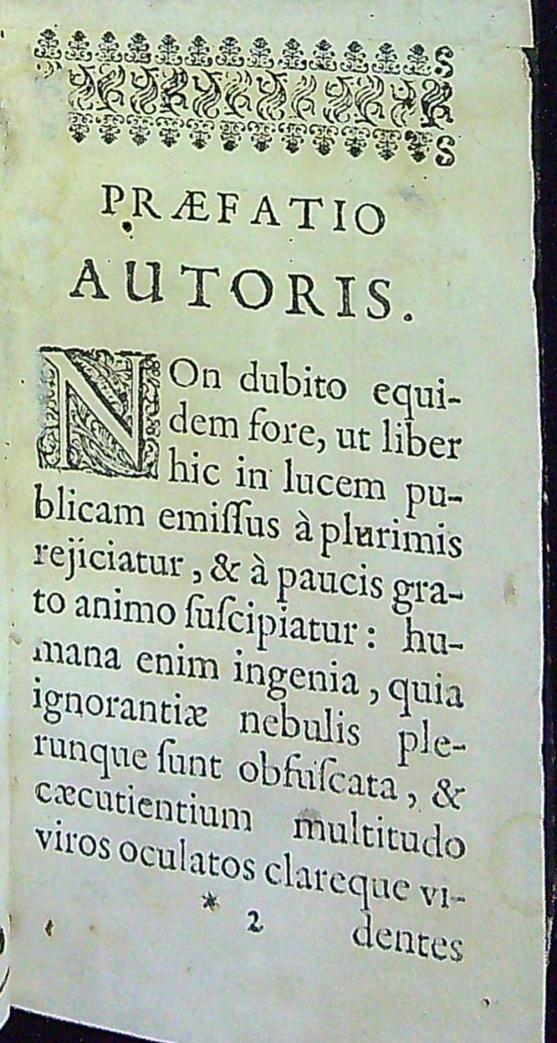 Červeno-černě tištěný titulní list s vinětou, konturové iniciály na rostlinném pozadí zalomené do výše 3-5 řádků, vstupní pásový vlys z ornamentů, tučně tištěné versálky ve výši 2 řádků, neživá záhlaví., viněty. Do latiny z francouzského originálu přeložil Ludwig Combach.