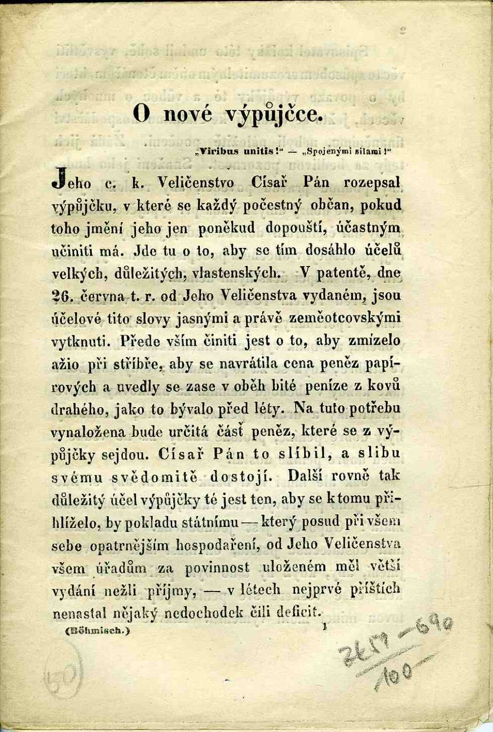 Výzva národům rakouským k účasti na státní výpůjčce s odvoláním na patent Jeho Veličenstva Císaře Pána ze dne 26.6. t.r.(?). - Dobrý stav.