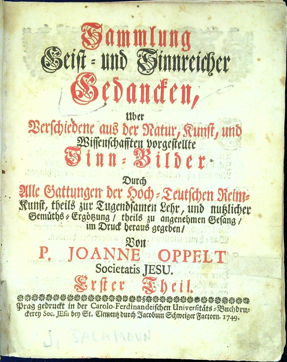 Johann Christoph Sysang (1703 - 1757) lipský kreslíř a mědirytec. Frontispisy vyzdobil ve 30. letech několik bohemikálních tisků a roku 1731 vytvořil portrét hraběte Šporka dle předlohy Františka Antonína Müllera. Dle Dlabačova "Lexikonu" žil a pracoval v letech 1720 až 1738 v Praze. Petr Voit ve své "Encyklopedii knihy" uvádí, že cyklus emblematických medailonů v knize Oppeltově byl již pravděpodobně otištěn v knize Caspara Jockische "Pax monarchiae internae" vydané ve dvou dílech v Praze roku 1730. Srovnáním obou děl se skutečně potvrdila domněnka Petra Voita, v knize Jockische je 38 totožných rytin Sysanga (třetí díl Oppeltovy s 20 rytinami v Jokischovi není). Dále jsem zjistil, že v Jokischově knize je také zcela totožný text árií, ód a madrigalů v německém jazyce jako v knize Oppeltově. Třetí díl Oppeltovy knihy s 20 mědirytinami a částí árií v německém jazyce je v Oppeltově disertaci "Pacis Monarchicae Tractatus Tertius" vydané v Praze roku 1731 - viz BCBT31574 (poznámka J. Placáka). - V nabízené knize jsou v prvních třech částech alegorické básně formou ód, árií a madrigalů, v části čtvrté (bez ilustrací) čtyři madrigaly přeložené z italštiny.