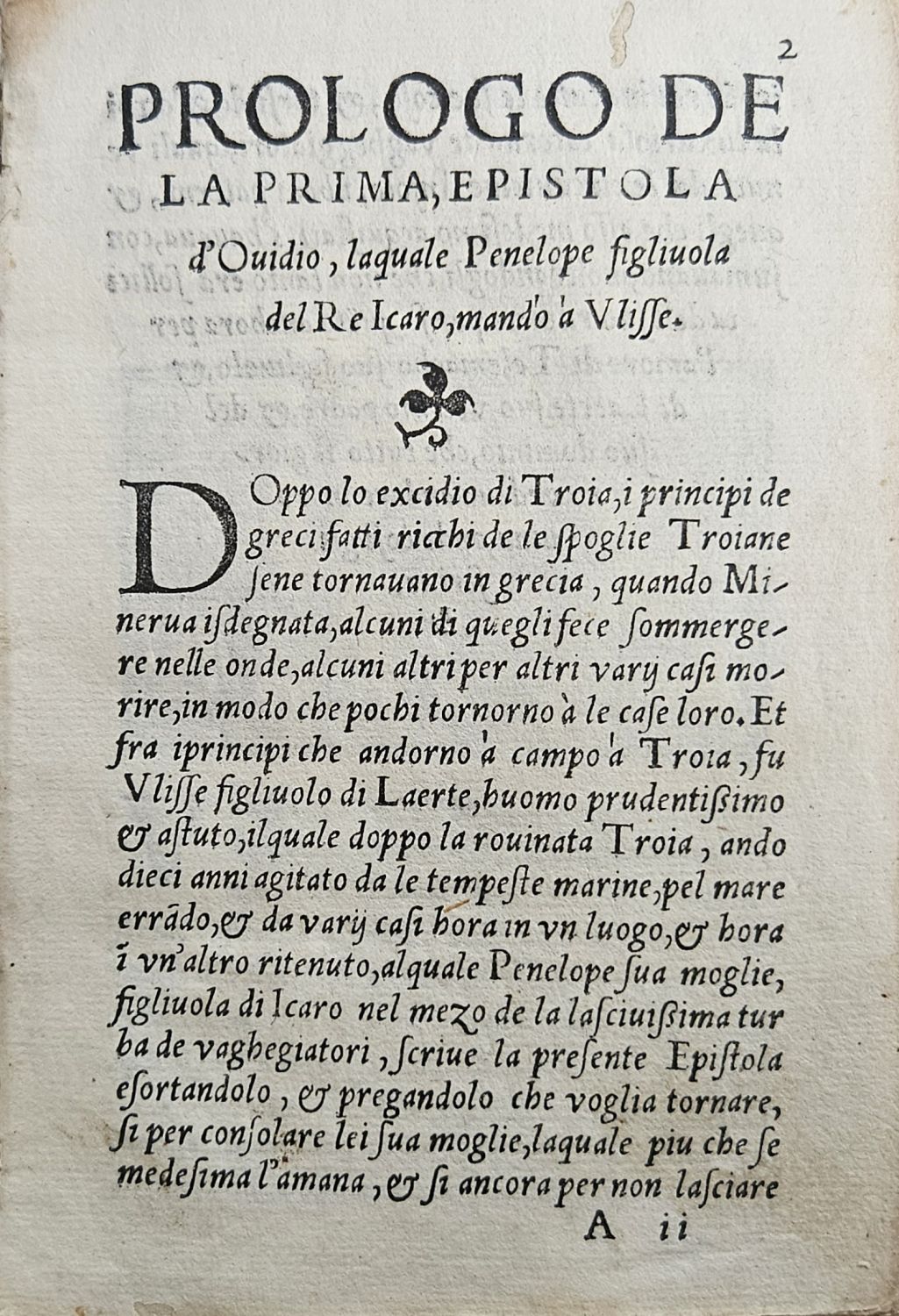 Titulní list olemovaný dřevorytovou bordurou, v textu 21 dřevorytů ve dvojitém jednoduchém rámečku. Živá záhlaví, tučně tištěné versálky ve výši 3 řádků, impresum v kolofonu "Qui finiscono le Epistole d´Ovidio. Nouamente stampate In Vinegia per maestro Bernardino de Vitali Venetiano. Del Mese di Aprile. M.D.XXXII." Na líci posledního nečíslovaného listu seznam dřevorytů v textu s názvem, označením zpěvu a číslem listu.
