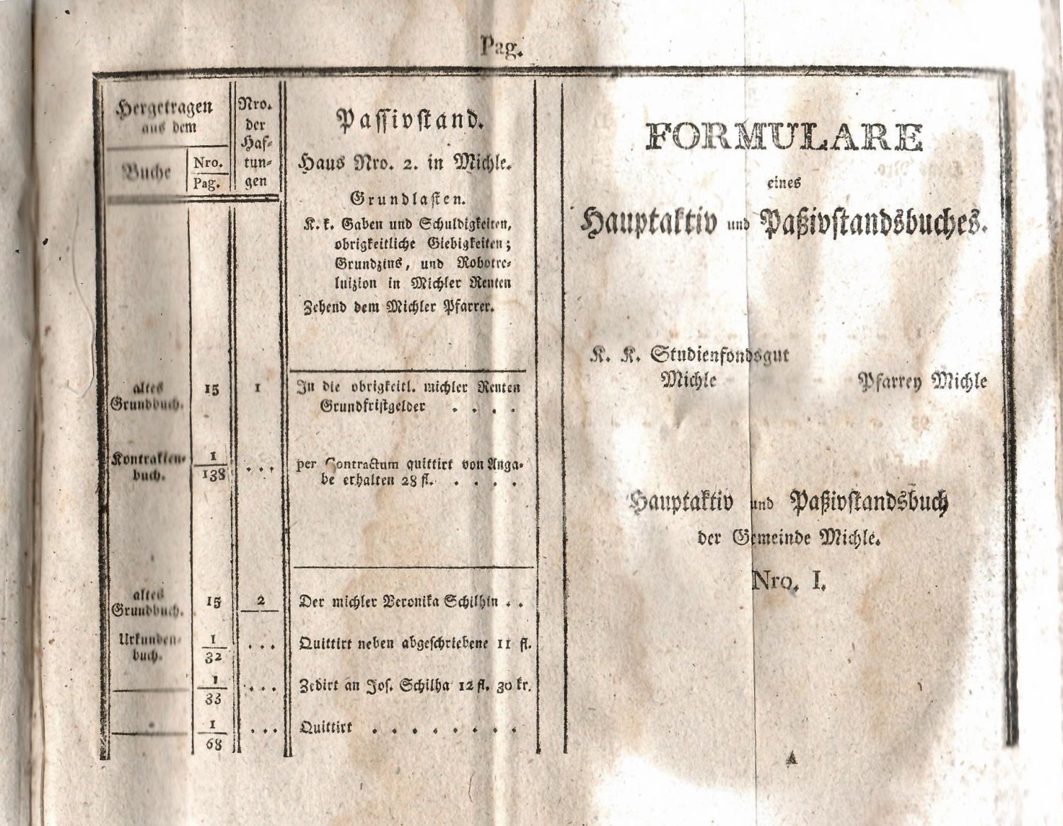Dobová kartonová vazba, při horním okraji hřbetu původní kožený štítek s tlačeným názvem, barvené ořízky. Vazba zašpiněná, místy odřená a pap. pokryv místy setřený, kožený štítek zčásti utržený, naražené rohy. V textu místy světle hnědé mapy od vlhkosti, papír místy lehce zvlněný. Na přední předsádce perem staré výpočtu, na jejím rubu nečitelné jméno jednoho z předchozích vlastníků.