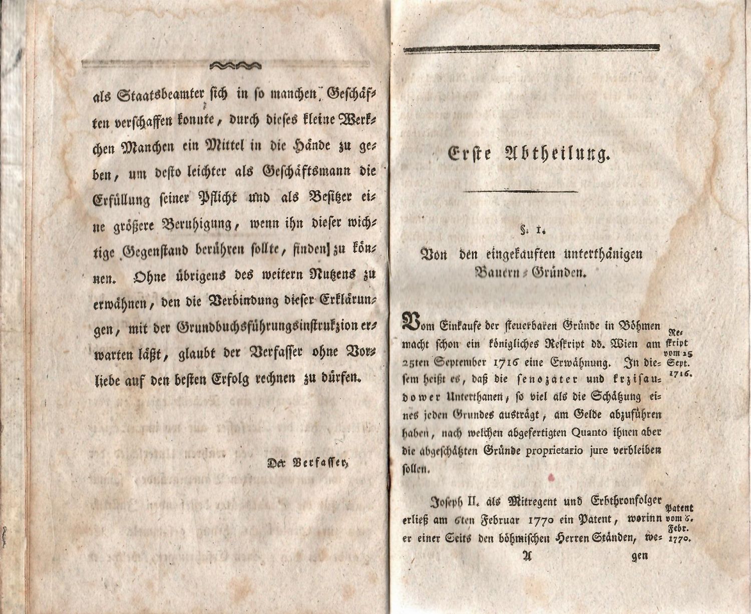 Wesentliche Erklärungen über den Unterschied zwischen eigekausten oder uneingekauften Bauerngründen in Böhmen.