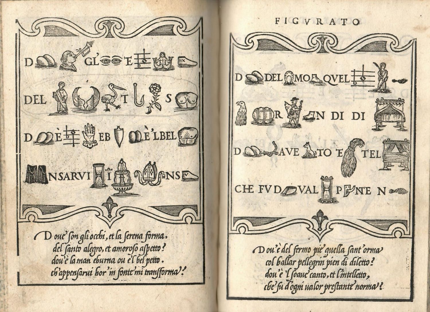 Text zasazený ve dvojitém rámečku z jednoduchých linek, konturové iniciály na ilustrativním pozadí zalomené do výše 6-9 řádků, v textu řada ukázek různých druhů písma, abeced, ale také šifry a různé proměny písma.