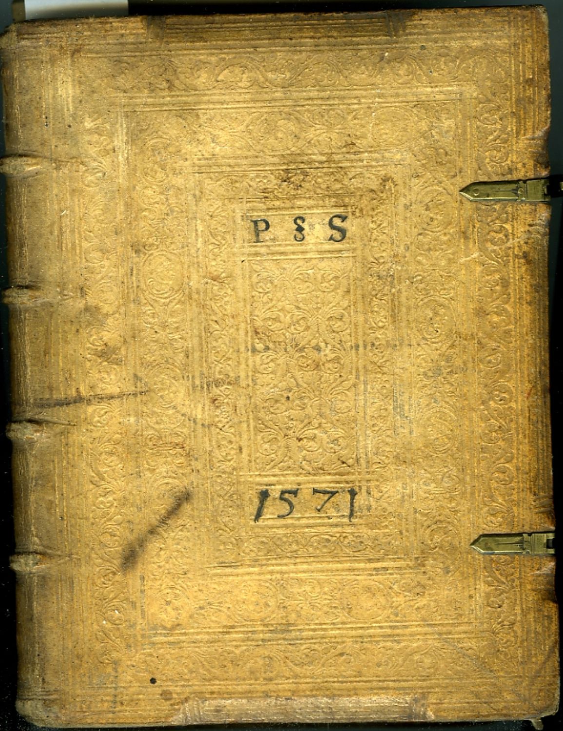 Renesanční dobová vazba. Bukové desky potažené světle hnědou vepřovicí zdobenou slepotiskem (trojitý rám, prostřední zdobený bustami králů a válečníků, druhé dva rostlinným a ornamentálním dekorem). Ve hřbetu 4 vazy, ve druhém a třetím poli inkoustem psaný název, v poli prvním staré knihovní číslo. Na přední desce dva původní kovové úchyty, na desce zadní plíšky přichycené kožené přezky s kovovými úchyty (původní a funkční). Na přední desce tlačené iniciály původního majitele (P. S.) a datace z roku 1571. V textu několik dobových rkp. marginálií. Na tit. listu prvního díla odtržen kousek papíru (cca 217 x 500 mm, text nedotčený) se jménem jednoho z předchozích vlastníků knihy. Papír místy lehce zažloutlý, na několika listech světlé hnědé mapy. Přesto ve stavu velmi dobrém.