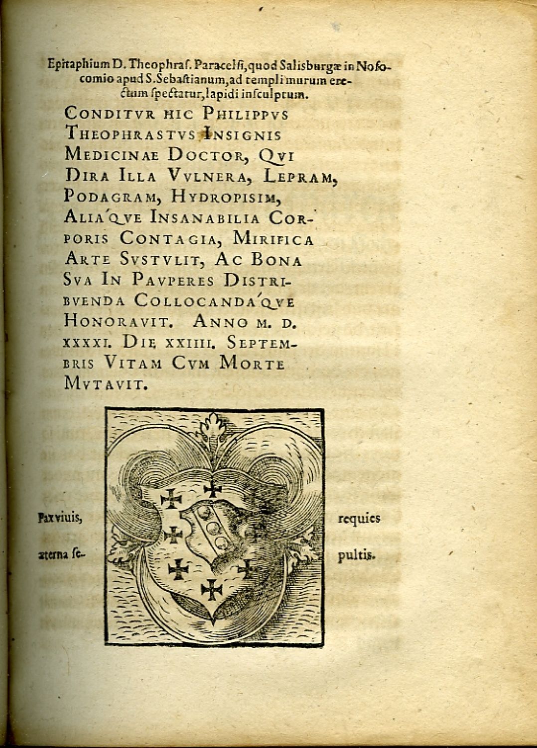 + 2. přívazek: Paracelsus "Des Hochgelehrte[n] vnd Hocherfahrnen Herren THEOPHRASTI PARACELSI von Hohenheim, beyder Artzney Doctoris, etliche Tractaten, zum ander mal in Truck aufgangen. Vom Podagra vnd seinen speciebus. Vom Schlag. Von der Fallender Sucht. Von der Daubsucht oder vnsinnigkeit. Vom Kaltenwehe. Von der Colica. Von der Bauchreissen. Von der Wassersucht. Vom Schwinen oder Aridura. Vom Schwinen oder Schwindtsucht, Hectica. Von Farbsuchten. Von Würmen. Vom Stullauff. Item newlich hinzu getruckt: Von den Podagrischen Kranckheiten, vnd auch was in anhengig ein Fragmentum". Cöln (am Rhein), Erben Arnold Birckmann, 1567, [VIII]-270 (recte 281)-[III] stran (poslední strana nepotištěná), na rubu titulního listu dřevořez (140 x 120 mm) ve dvojitém rámu (uvnitř rámu latinský text velebící Paracelsa) s portrétem Paracelsa, který se opírá o meč s nápisem Azoth (universální lék, cíl snažení řady alchymistů, později jméno pro rtuť), signatury, stránkové kustody, nad vnějším okrajem textu arabská paginace stran, zčásti versálkami latinsky tištěná živá záhlaví s označením kapitol, zčásti gotikou německy, od strany 124 chybná paginace až do konce. Iniciály propletené úponky ve výši 4 řádků, tištěné poznámky po stranách, latinsky tištěné nadpisy jednotlivých kapitol, na líci poslední nepaginované strany latinský epitaf z náhrobku Paracelsova s dřevořezem ochranného štítu ze stejného náhrobku. (VD16 P443).