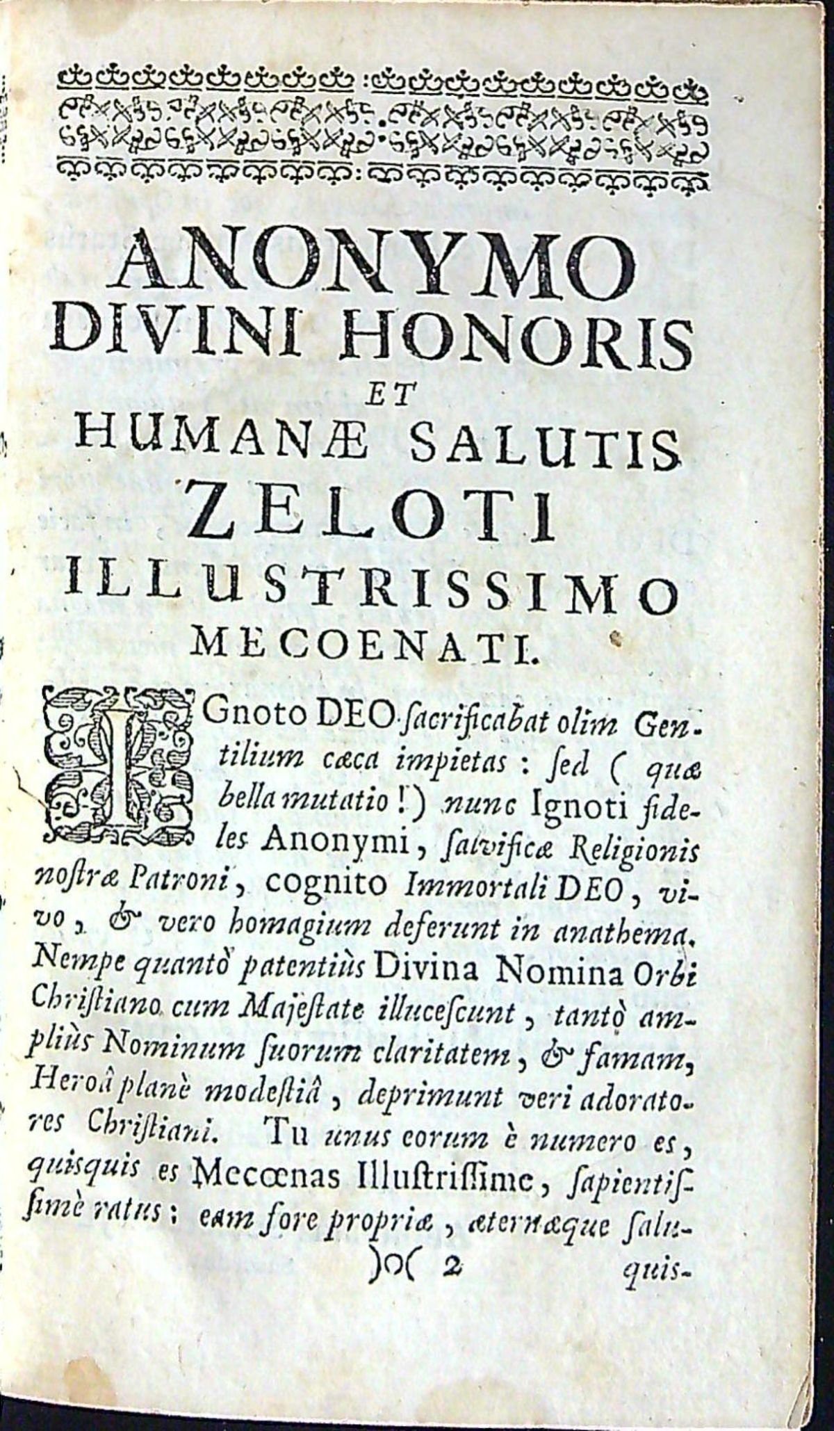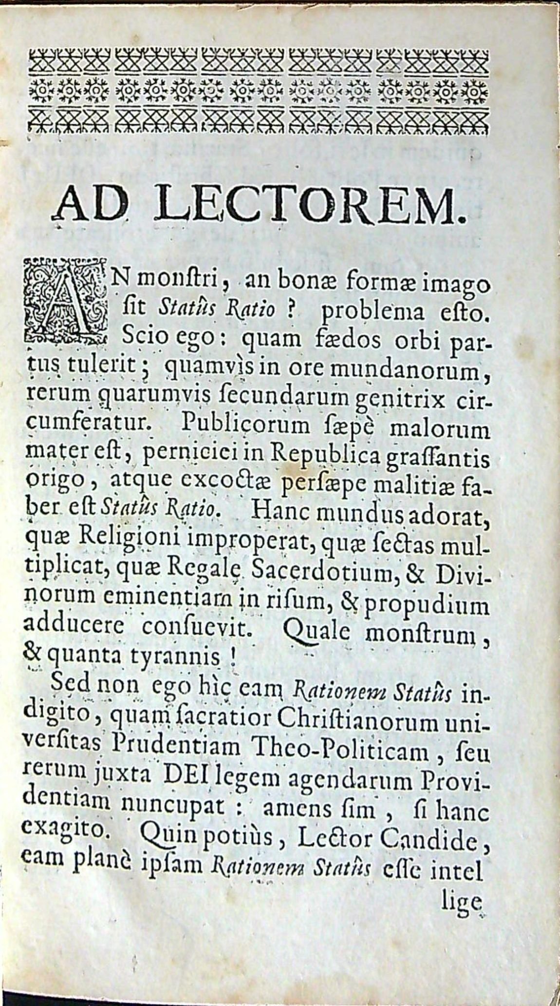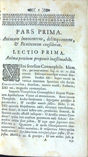 RATIO STATUS ANIMAE IMMORTALIS ASCETICE HISTORICE, POLEMICE COMMODO EORUM, QUI: AUT IN DOMINICO ECCLESIAE AGRO, AD Procurandam animarum Messem, aut inter gentem convulsam, & dilaceratam ad extirpanda vitiorum, & haereseon zizania SACRIS MISSIONIBUS ET CONCIONIBUS DESTINANTUR; bEX Divinis Scripturis, Sanctorum Patrum Commentariis, Controversarum in fide quaestionum Scriptoribus, vitaeque Magistorum Commentationibus, ac Historiarum monimentis compendiosa methodo COMBINATA. Praemissis singula ante Capita brevioribus Dissertationibus, quibus aut virtus commendatur, aut exagitatur vitium. Opus cuilibet hominum statui pro discursu perutile. A QUODAM SOCIETATIS JESU SACERDOTE.