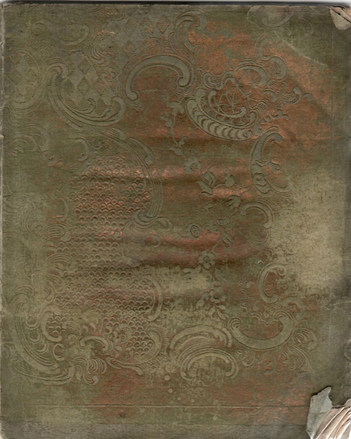 Dobová pap. obálka ze zeleného papíru zdobeného tlačeným, částečně zlaceným, rostlinným reliéfem. Obálka místy zašpiněná a odřená, zlacení místy vybledlé, knižní blok zčásti rozvolněný, při spodním okraji u hřbety světlé mapy od vlhkosti, oslí uši.