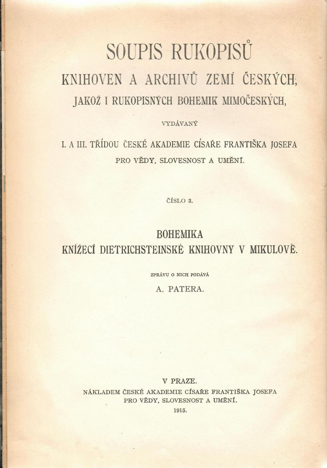 Soupis rukopisů knihoven a archivů zemí českých, jakož i rukopisných bohemik mimočeských, vydávaný I. a III. třídou České akademie cís. Fr. Josefa pro vědy, slovesnost a umění, č. 3. - Na přídeští staré antikvariátní exlibris.