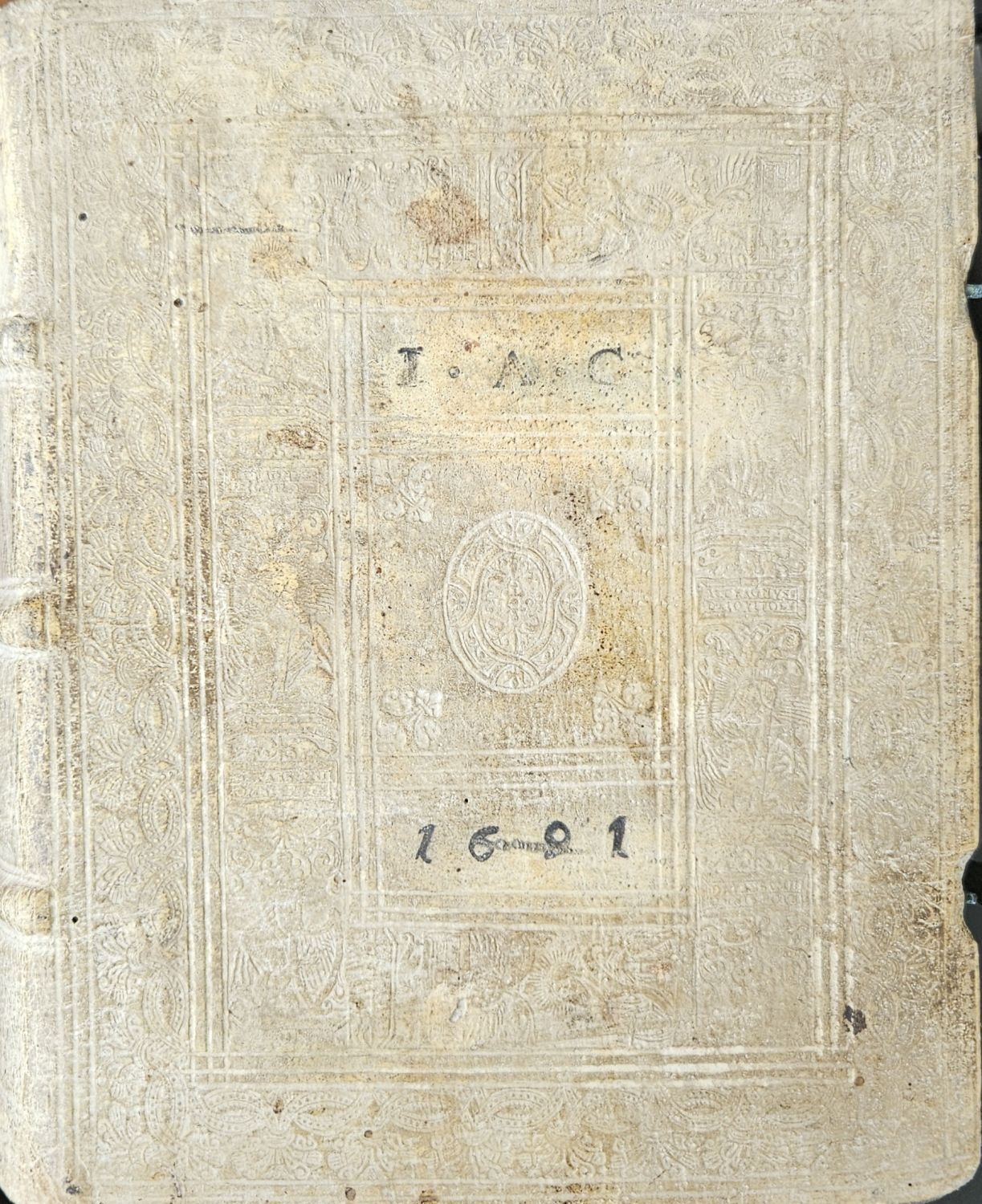 Dobová vazba ze světlé vepřovice zdobené slepotiskem, barvené ořízky, ve hřbetu tři vazy, na přední desce tlačené a černě barvené vlastnické iniciály I.N.C. a datum 1691. Na přední desce dva kovové trny, na desce zadní původní kožené přezky a na přezce spodní původní plechový úchyt. Na tit. listu začerněné jméno jednoho z předchozích vlastníků.