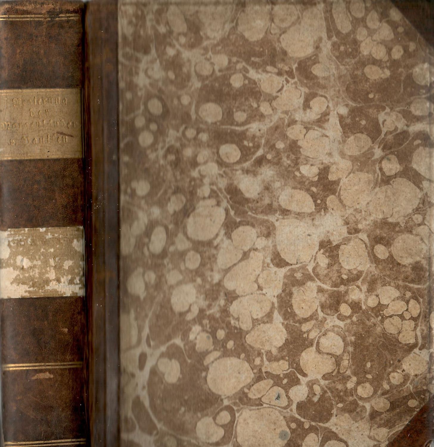 Dobová vazba s deskami potaženými mramorovaným papírem, kožený hřbet a nárožnice, ve hřbetu ve druhém poli světlý kožený štítek s tlačeným a zlaceným názvem, ve čtvrtém poli nepatrný zbytek původního štítku, naražené rohy a kůže ve hřbetu lehce odřená, na přídeštích dobový olejový papír, na rubu předního vakátu rkp. soukromý proven. záznam s nečitelným jménem. Titulní list prvého díla při vnějším spodním okraji v délce cca 10 a šířce cca 1 nepravidelně utržený. V textu na několika místech drobné světle hnědé mapky.
