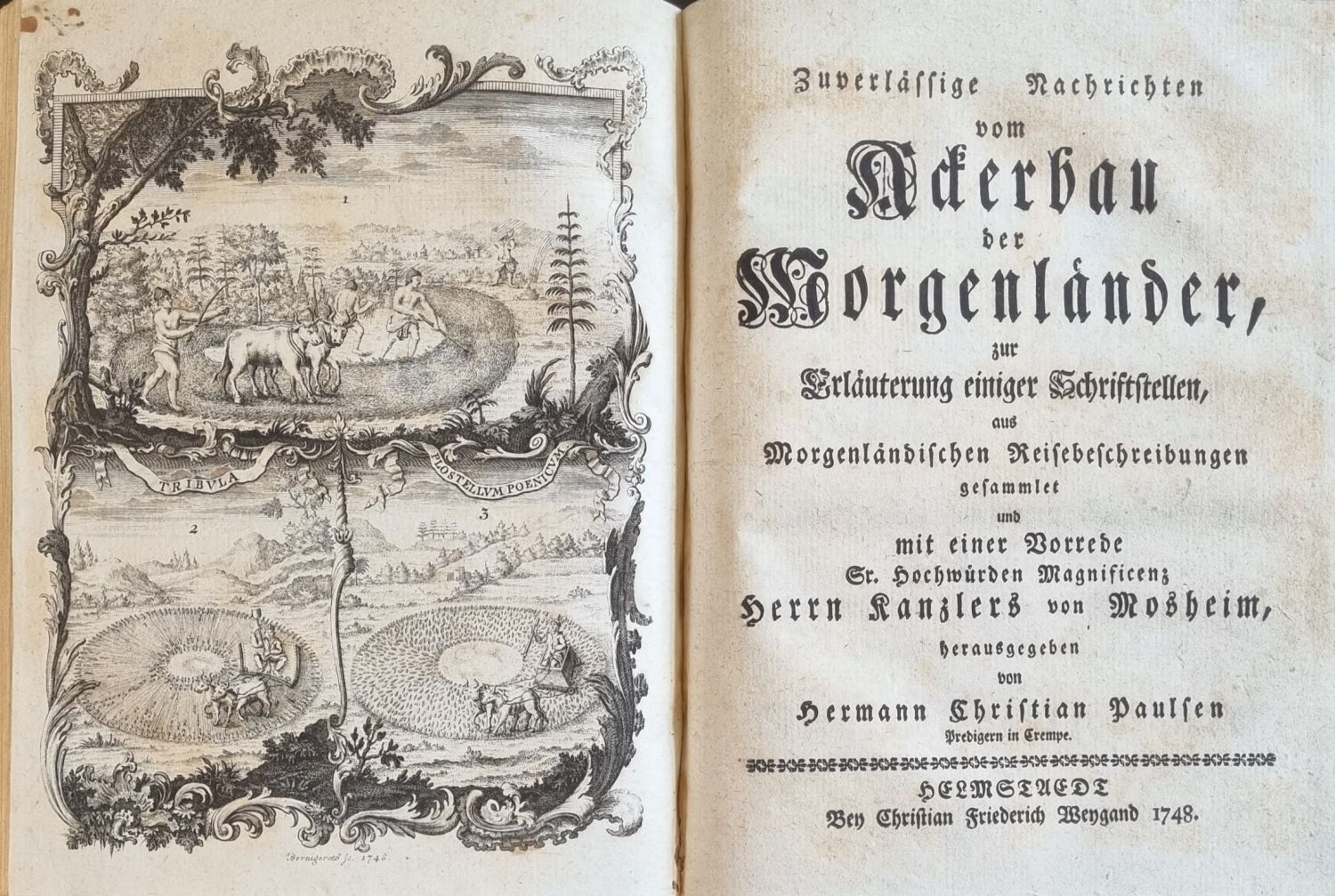 + přívazek: Hermann Christian Paulsen "Zuverlässige Nachrichten vom Ackerbau der Morgenländer, zur Erläuterung einiger Schriftstellen, aus Morgenländischen Reisebeschreibungen gesammlet und mit einer Vorrede St. Hochwürden Magnificenz Herrn Kanzlers [Johann Lorenz]von Mosheim, herausgegeben von .... Helmstedt, Christian Friedrich Weygand, 1748, Front.-[XLII]-153-[III] str. + 1 mědiryt. příloha. 1. vydání. Ve front. mědirytina signovaná Bernigeroth 1748 s vyobrazením úprav pozemků pro zemědělství, za obsahem celostr. mědirytina s vyobrazením pluhu indiánů (Indů). Živá záhlaví, tištěné poznámky pod čarou ve dvou sloupcích, viněty, plné iniciály propletené úponky zalomené do výše 3 řádků, plné iniciály v rámečku z ornamentů ve výši 4-5 řádků, pásové vlysy z rostlinných ornamentů. - Kniha pojednává o zemědělství a životě na venkově na Blízkém a Středním východě a srovnává popisy vybrané z různých cestopisů s pasážemi Písma, které se týkají Orientu.