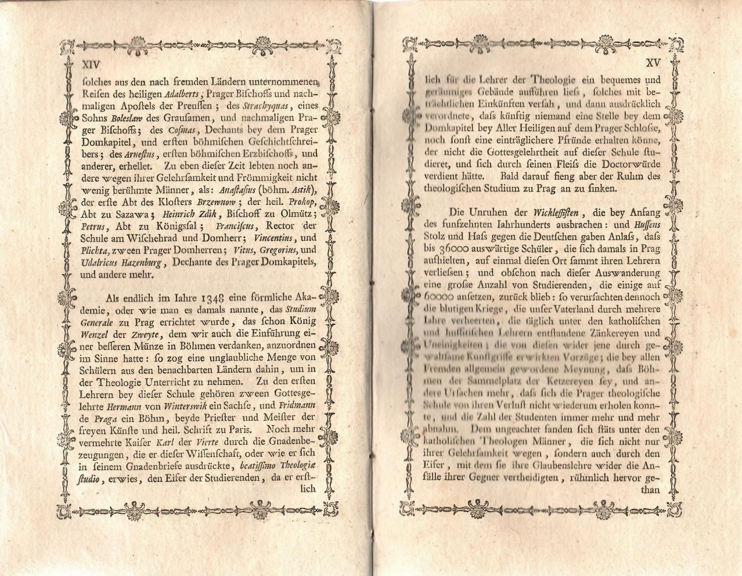 Německý, český i latinský text antikvou, úvodní Pelclovy dedikace kursivou, str. všech dílů v rámcích z rokokových ozdob, linky, dvoulinky, tyče, ozdůbky, versálky ve výši 2-3 ř., signatury, str. kustody, ve vnějších rozích římské i arabské stránkování, tištěná errata.