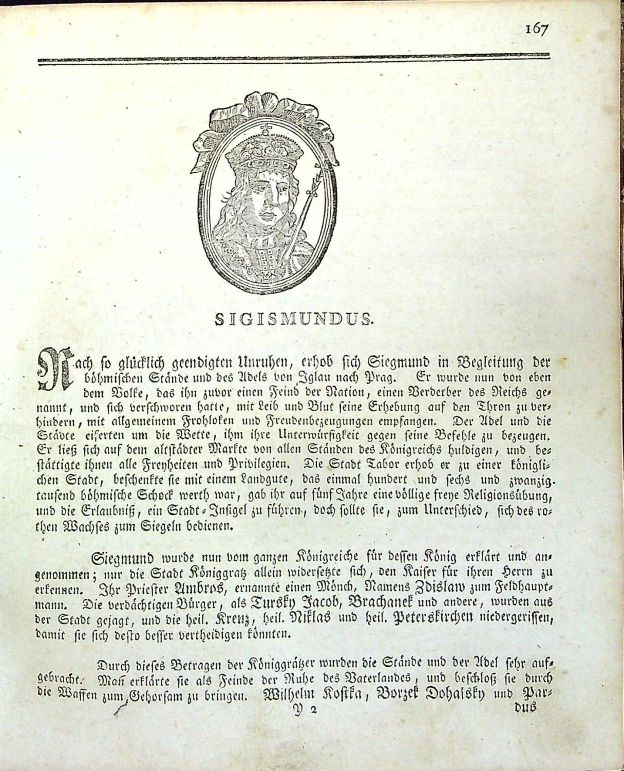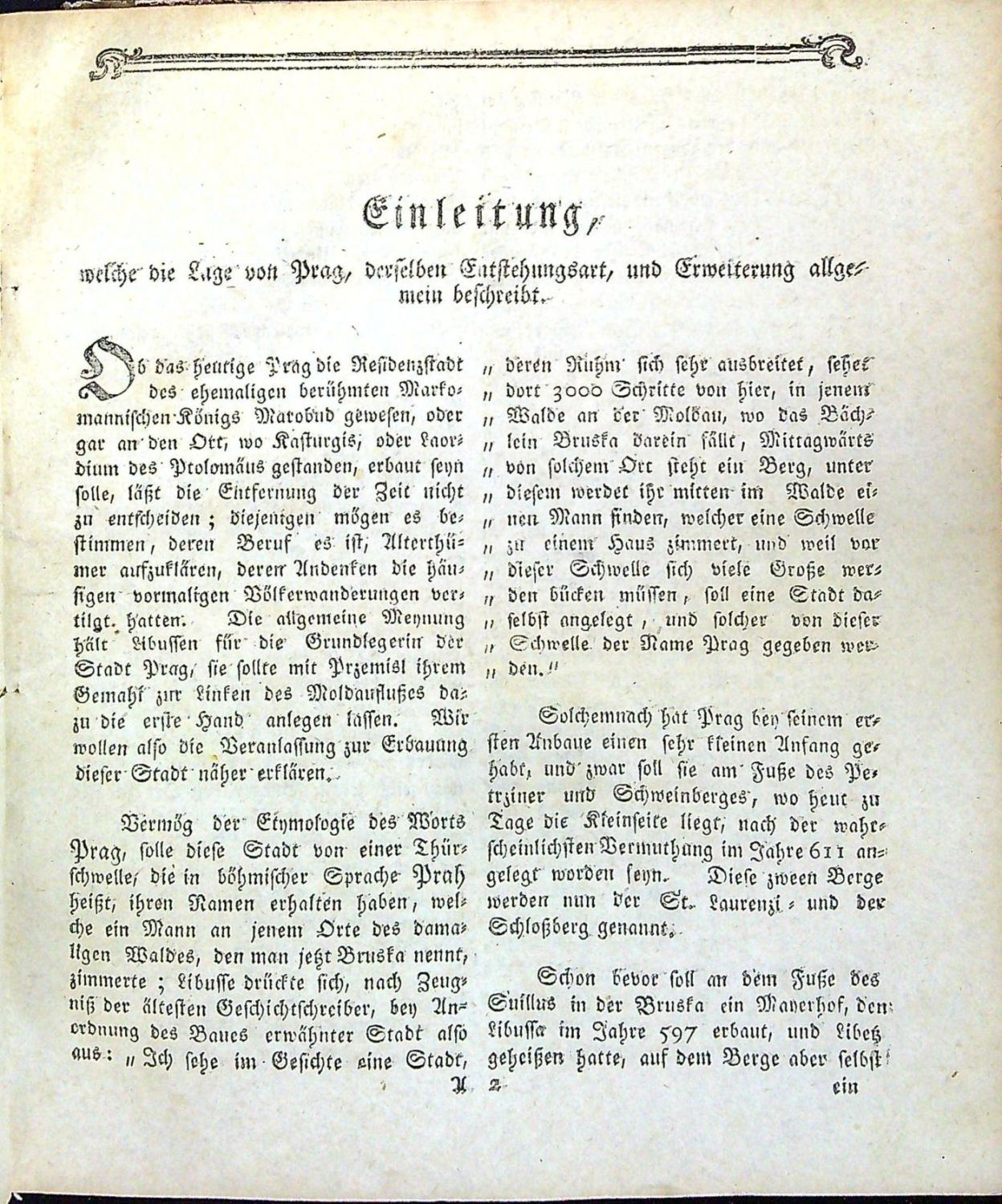 Německý text gotikou, latinská jména panovníků versálkami a antikvou, signatury, stránkové kustody, arabské číslování stran při horním vnějším okraji, živá záhlaví, iniciály ve výši 2 řádků, viněty, dvojité jednoduché linky, viněty, rejstřík tištěný ve dvou sloupcích, chyby v paginaci. Za rejstříkem na s. 1 druhého dílu mezititul: "Beschreibung der königlichen Haupt= und Residenzstadt Prag. 1781", druhý díl tištěný ve dvou sloupcích, na s. 67/68 stručná historie Židovského města "Anhang von der Judenstadt", na s. 93 mezititul: "Geographischhistorische Beschreibung aller im Königreich Böheim befindlichen Städte, und anderer Merkwürdigkeiten. 1781".