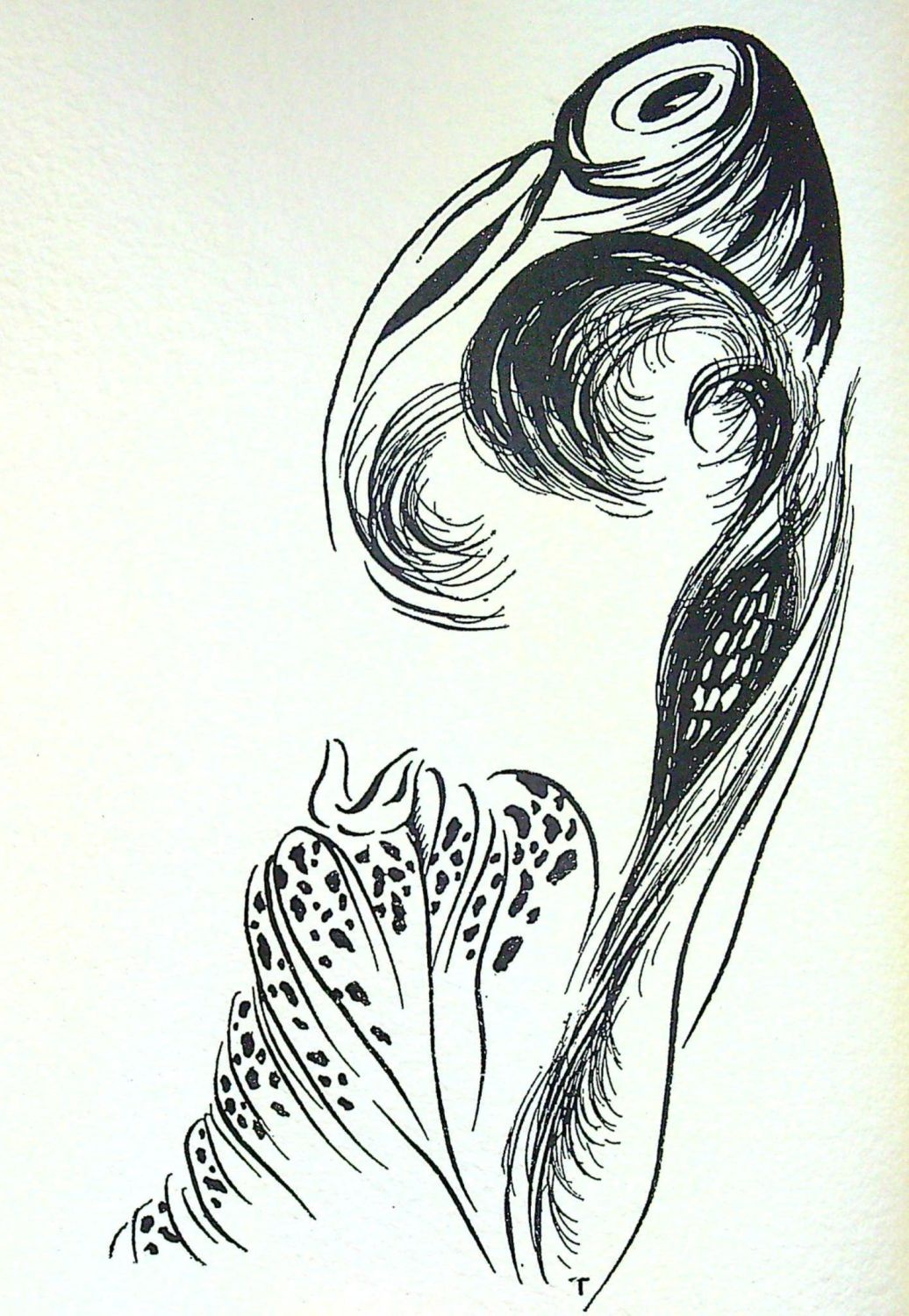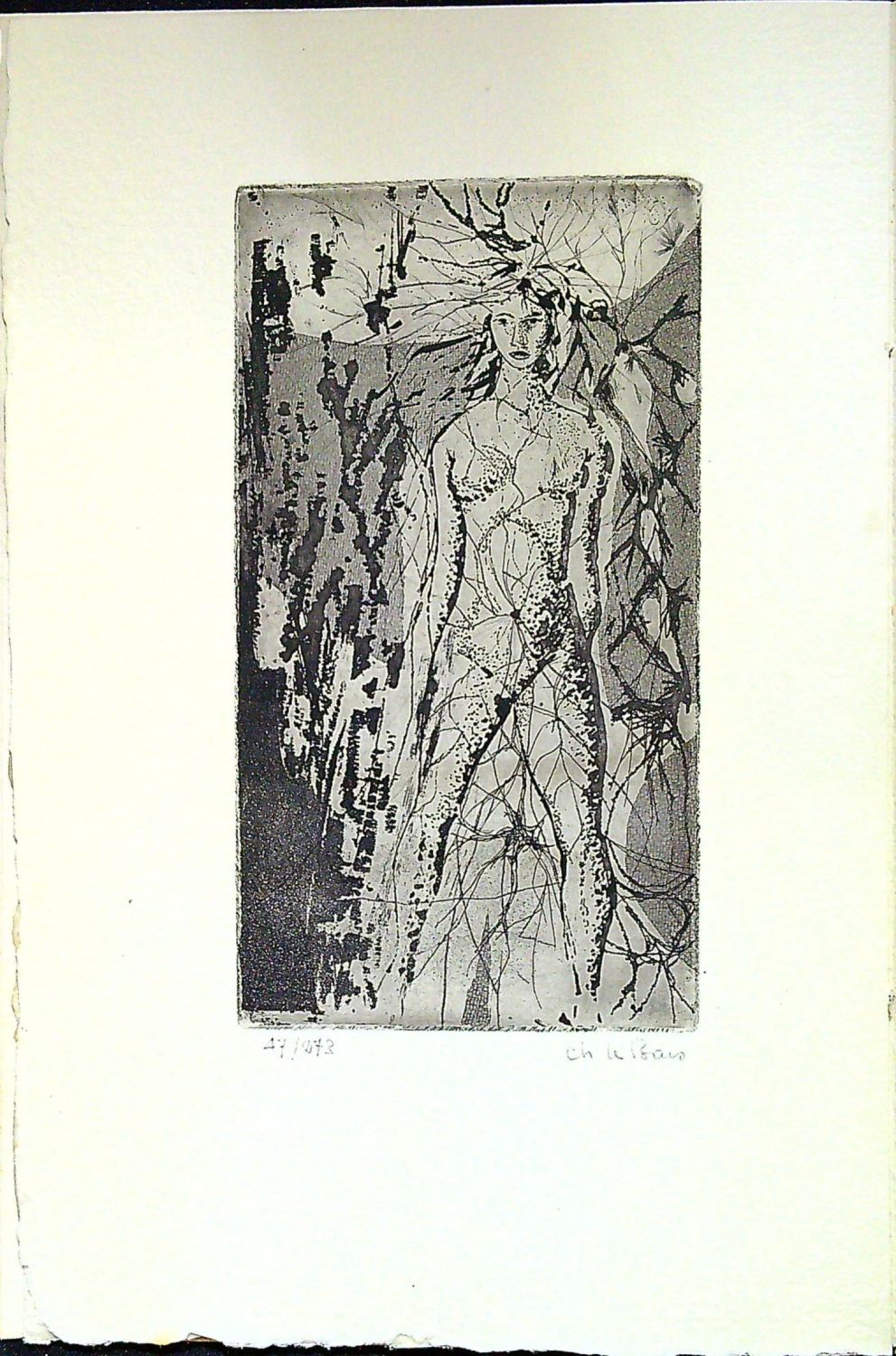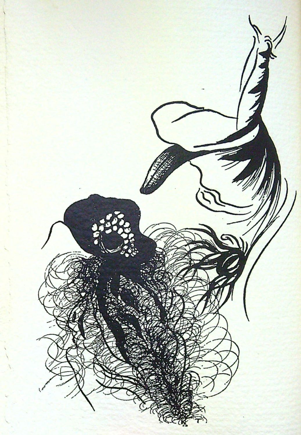 + Jehan Mayoux "A perte de vue", Ussel, Jehan Mayoux, 1958. 44 stran + 4 listy (z toho dva čistý), ve front. pův. suchá jehla (150 x 85 mm) od Charlese le Bars, autorem vpravo dole pod deskou tužkou podepsaná, vlevo dole číslovaná 47/273. Na patitulu rkp. dedikace autorova Maurici Lebrunovi. Červeně tištěný titul, versálky a jedna ilustrace za šesti, kterými je vyzdobena stať "Cuilléres d´amour" (Lžíce lásky), autor ilustrací - Claude Migeon. Obě díla vyšla společně a jsou tištěna na stejný papír, stejným písmem a stejným tiskařem.