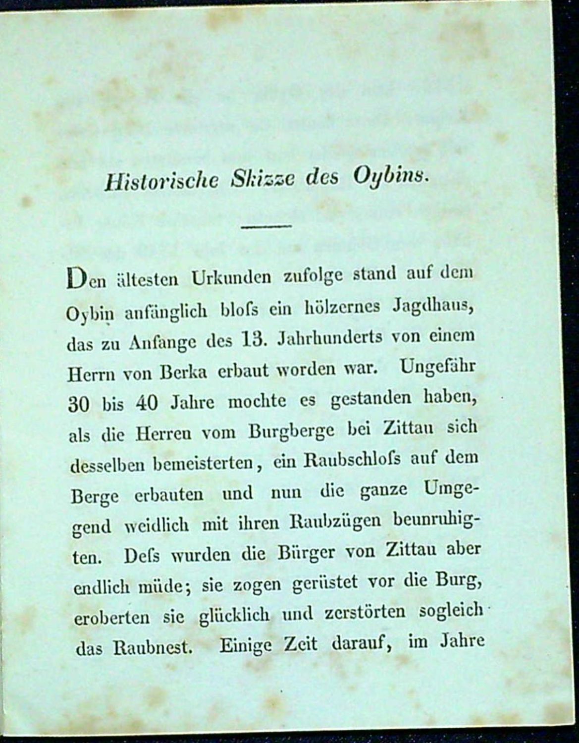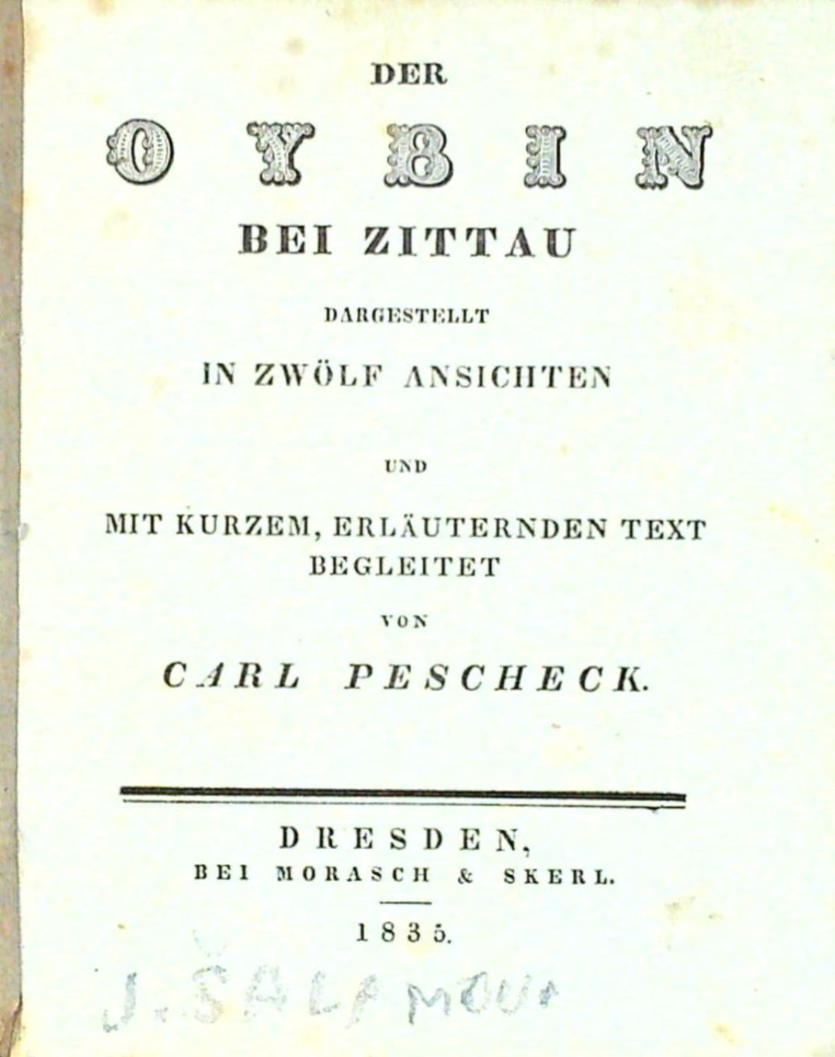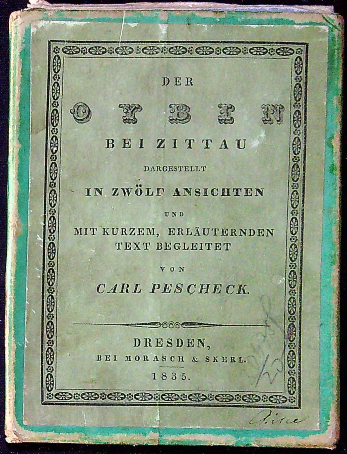 Tištěno antikvou, za titulní listem úvodní slovo vydavatelů, na straně 5-8 stručná historie Oybína od C. Peschka, na str. 9-13 doprovodný text k rytinám, na posledním listu seznam knihy vydaných Moraschem a Skerlem. - Původní ochranný kartonový přebal, ve kterém je volně vložený šitý a pův. pap. páskou ve hřbetu přelepený tištěný doprovodný text a 14 listů rytin. Původní zelené kartonové pouzdro, na přední jeho straně nalepený světle zelený list s názvem a impresem. Pouzdro (rozměr 130 x 100 mm) při hranách lehce odřené. Podpisy tužkou Jiřího Šalamouna.