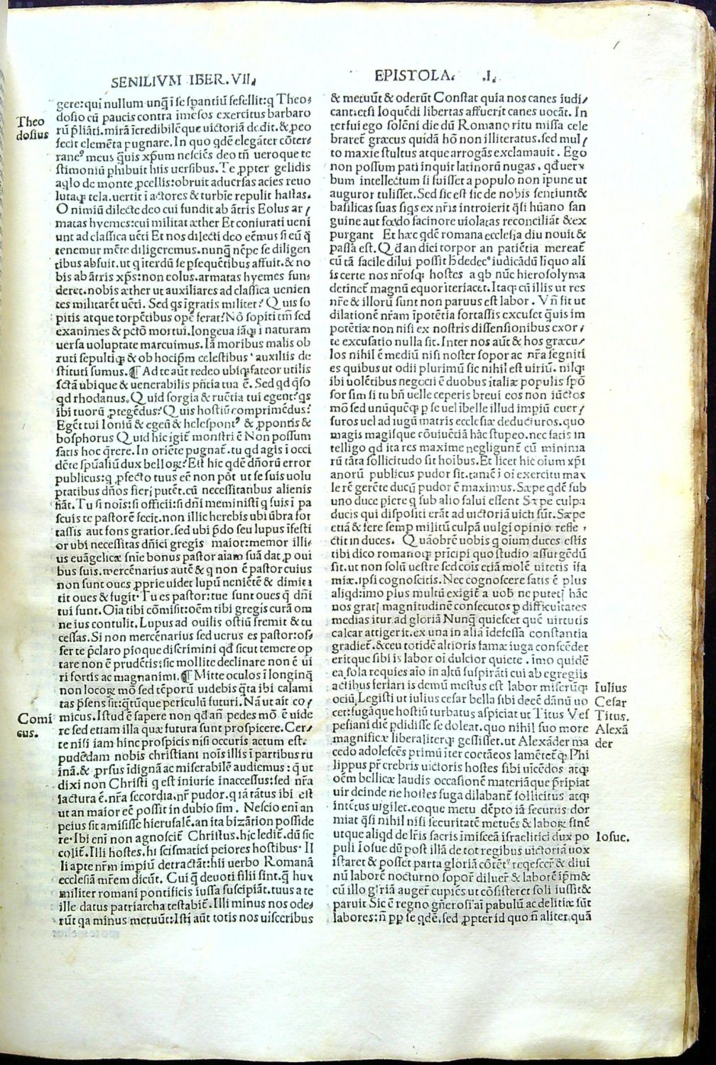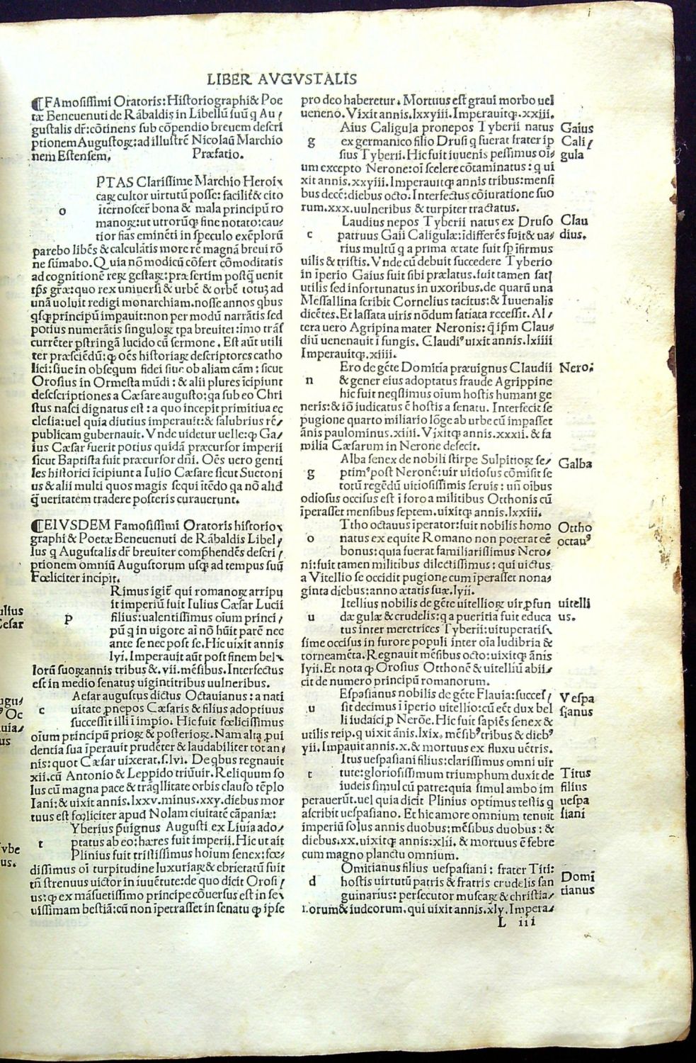 Tištěno antikvou, titulní listy rotundou, sazba ve dvou sloupcích, živá záhlaví, tištěné poznámky po stranách. Na foliu A1a text olemovaný dřevořezovou bordurou, vynechaná místa ve výši 3-8 řádků pro malované iniciály - pouze vstupní iniciála doplněna, s malými předtištěnými vzory pro iluminátora, tištěné rubriky. Na foliu 8-8a (list 494) kolofon a signet tiskařův. Na následujícím foliu (A-1a druhý titulní list "Bucolicum Carmen in duodecim eglogas distinctum cum comento Beneuenuti Imolensis viri Clarissimi." Foliace: +4; A-K8; L-6; M-Z8; AA-8; BB-CC6; aa-dd8; c-10; a-z8; &-8; {-4; 1-7-6; 8-8; A-E8.