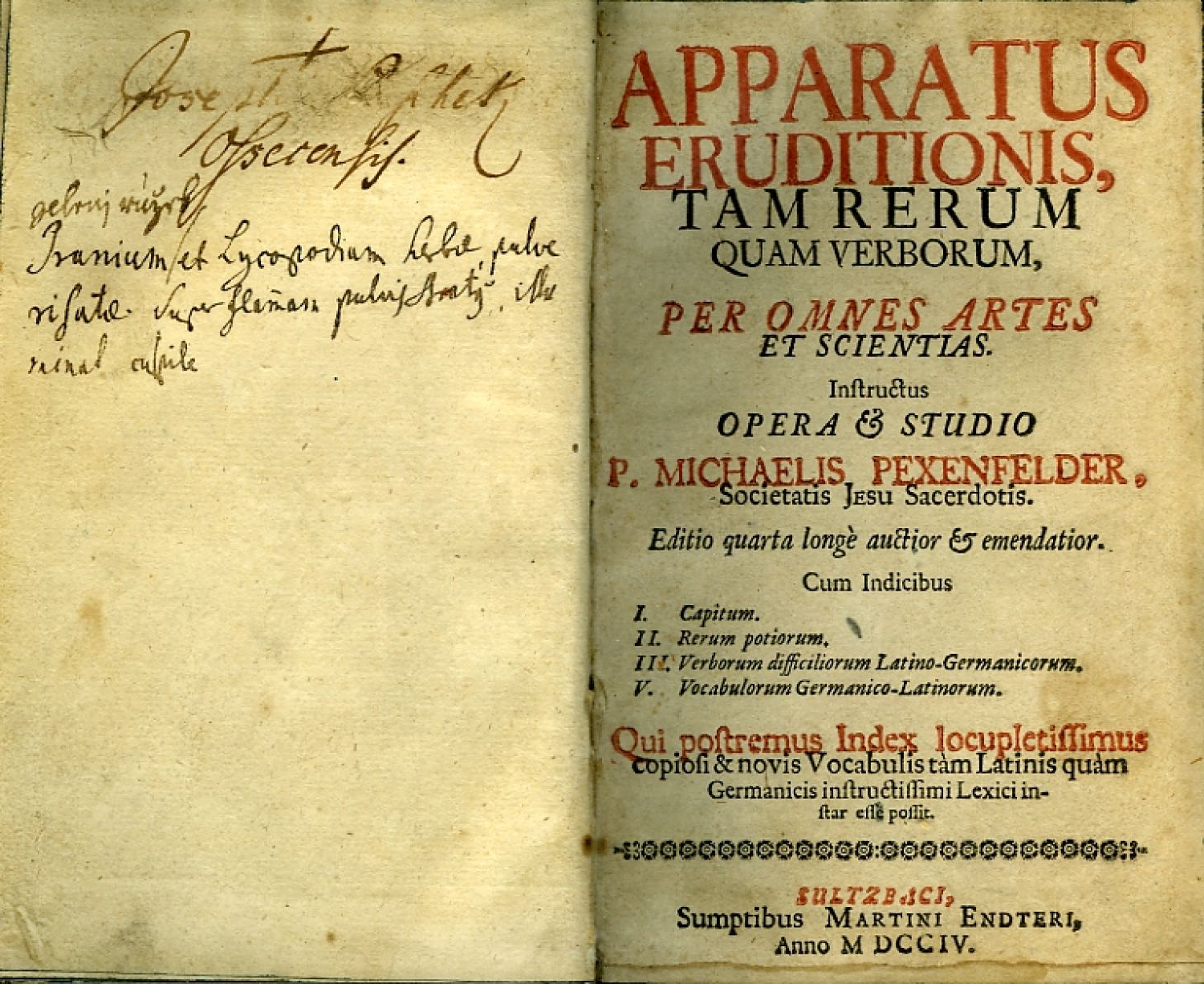 APPARATUS ERUDITIONIS, TAM RERUM QUAM VERBORUM, PER OMNES ARTES ET SCIENTIAS. Iunstructus OPERA et STUDIO P. MICHAELIS PEXENFELDER, Societatis Jesu Sacerdotis.