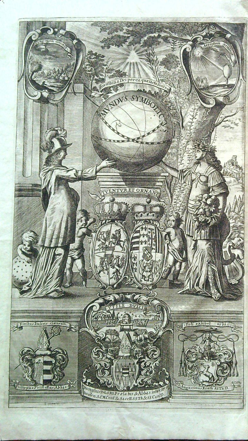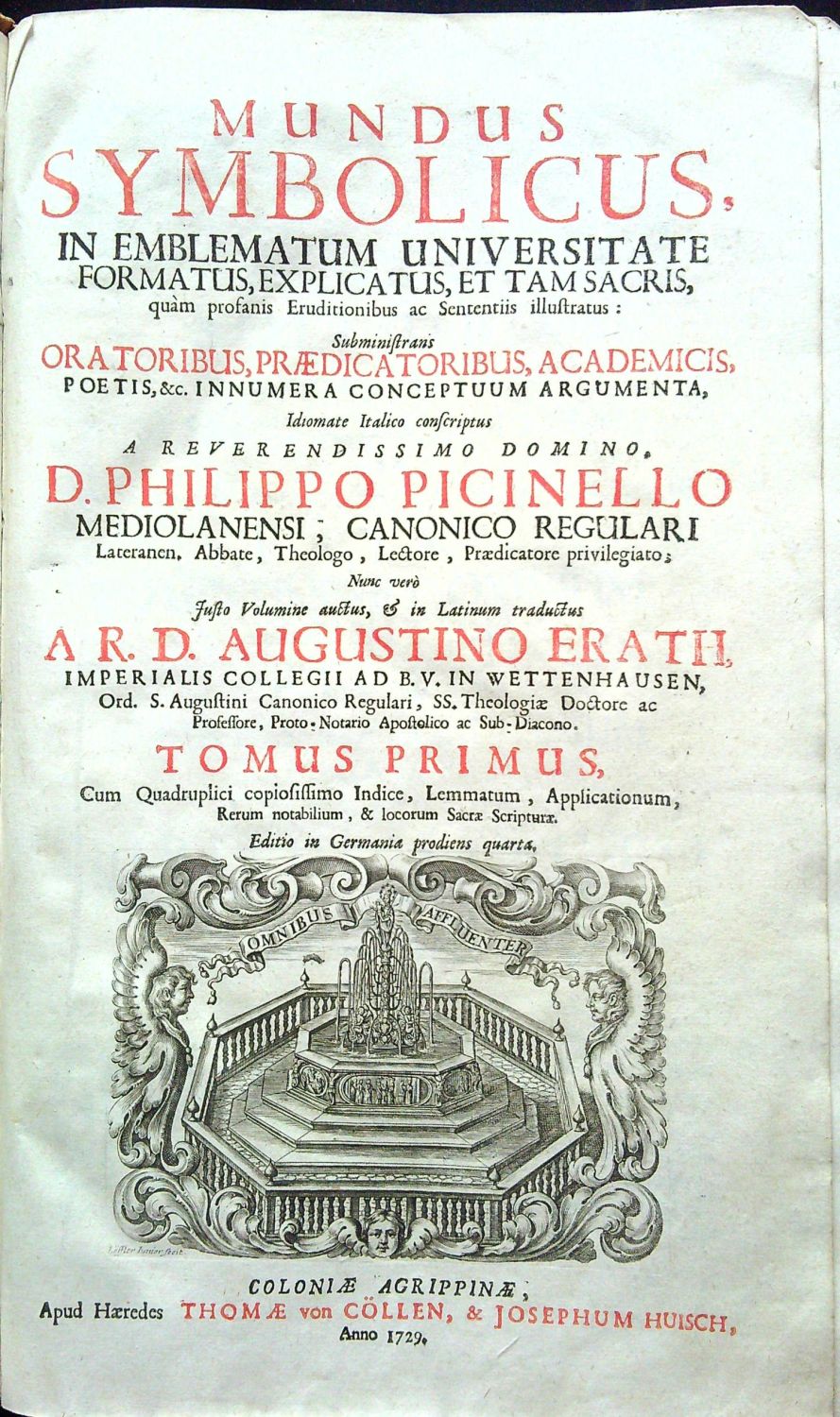 MUNDUS SYMBOLICUS, IN EMBLEMATUM UNIVERSITATE FORMATUS, EXPLICATUS, ET TAM SACRIS, quam profanis Eruditionibus ac Sentensis illustratus: Subministrans ORATORIBUS, PRAEDICATORIBUS, ACADEMICIS, POETIS, &c. INNUMERA CONCEPTUUM ARGUMENTA, Idiomate Italico coscriptus A REVERENDISSIMO DOMINO, D. PHILIPPO PICINELLO MEDIOLANENSI; CANONICO REGULARI Lateraten, Abbate, Theologo, Lectore, Praedicatore privilegiato; Nunc vero Justo Volumine auctus, et in Latinum traductus A R. D. AUGUSTINO ERATH, IMPERIALIS COLLEGII AD B. V. IN WETTENHAUSEN, Ord. S. Augustini Canonico Regulari, SS. Theologiae Doctore ac Professore, Proto-Notario Apostolico ac Sub-Diacono. Tomus I. + II.