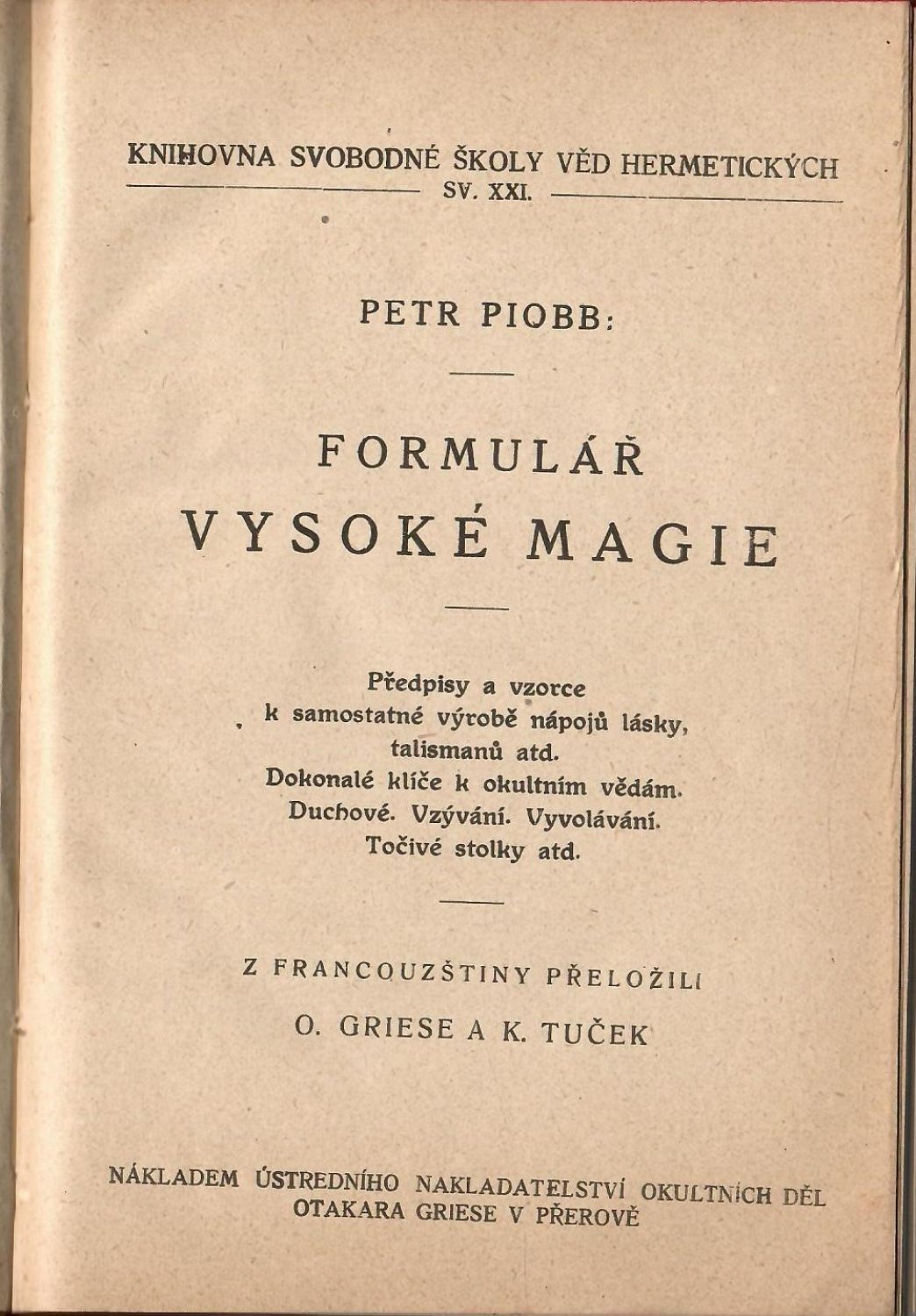 Formulář vysoké magie. Předpisy a vzorce k samostatné výrobě nápojů lásky, talismanů atd. Dokonalé klíče k okultním vědám. Duchové. Vzývání. Vyvolávání. Točivé tabulky atd. Z francouzštiny přeložili O. Griese a K. Tuček.