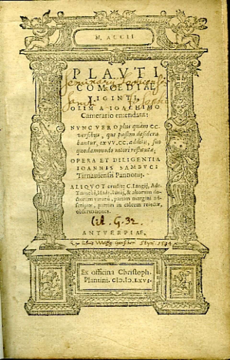 PLAVTI COMOEDIAE VIGINTI, OLIM A IOACHIMO Camemario emendatae: NVNC VERO plus quam CC. versibus, qui passim desiderabantur, ex VV. CC. additis, suo quodammodo nitori restitutae; OPERA ET DILIGENTIA IOANNIS SAMBVCI Tirnauiensis Pannonij. ALIQVOT erudite C. Langij, Adr. Turnebi, Hadr. Iunij, & ahorum doctorum viroru, partim margini adscriptae, partim in calcem reiectae, obseruationcs.