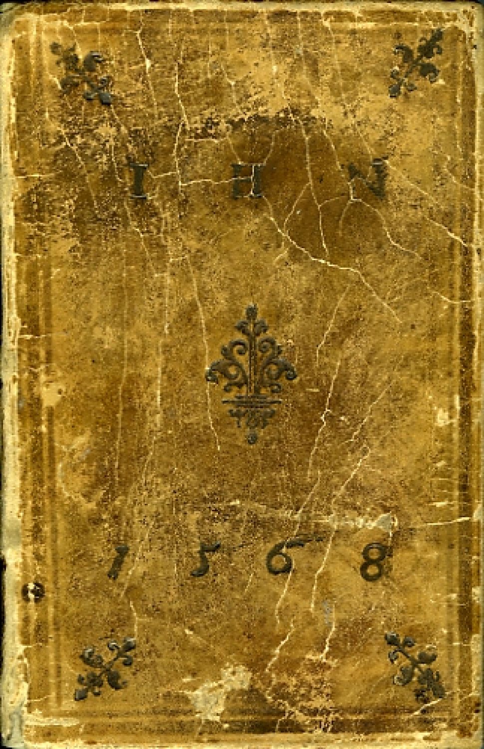 Dobová vazba z hnědé hověziny z roku 1568 (na přední desce vytlačená datace), na obou deskách tlačený jednoduchý rám, v jeho vnitřních rozích tlačené ozdůbky rostlinného charakteru, uprostřed rámu tlačená arabeska, na přední desce v horní části vytlačené iniciály prvního vlastníka knihy (I.H.N.). Na předním i zadním přídeští inkoustem kreslené erby s latinskými nápisy (na předním Domine Deus ?, na zadním Esse bonis natu maioribus infima Laus at virtutis maior amore ?), na tit. listu vlastnický přípis z roku 1584 (Ex libris Wolffg: Garscheri Styri 1584). Ve hřbetu tři vazy, v prvním poli hnědý kožený štítek s názvem, ve třetím poli zelený kožený štítek s tlačeným nápisem "Cura Sambuci" (péčí Sambuca). Vazba ohmataná a místy odřená a lehce popraskaná. Zlacené a cizelované ořízky s ornamentem.