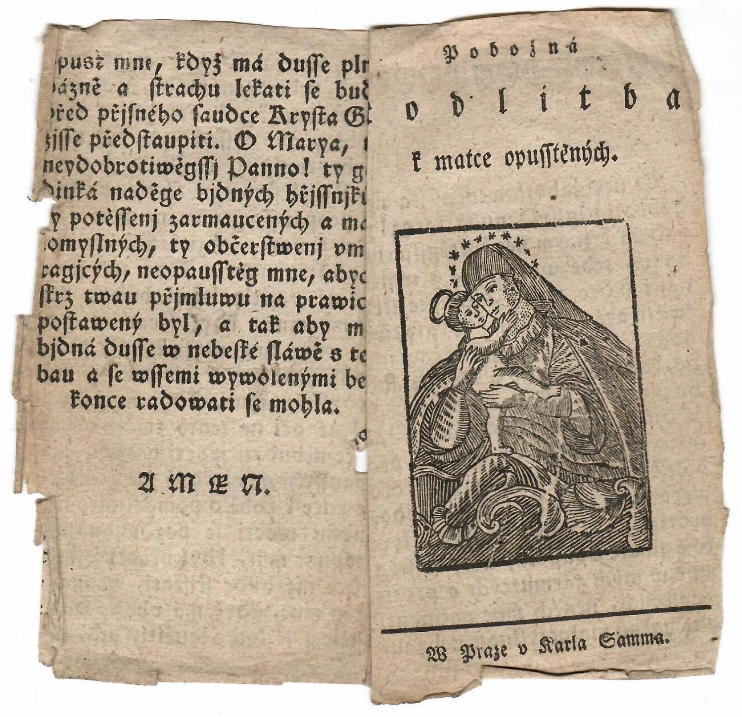 Tištěno švabachem, stránkové kustody, na titulním listu dřevoryt v jednoduchém rámečku (75 x 52 mm) s vyobrazením Marie s Jezulátkem v náruči, impresum odděleno jednoduchou linkou, na rubu prvního listu v záhlaví lišta z ornamentů. - Původní dvoulist při vnějších okrajích pomačkaný a místy potrhaný, druhý list při vnitřním okraji proděravělý (cca 0,5 x O,5 cm).