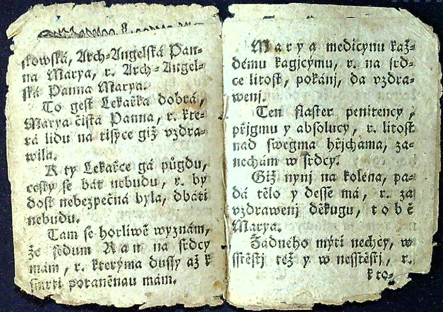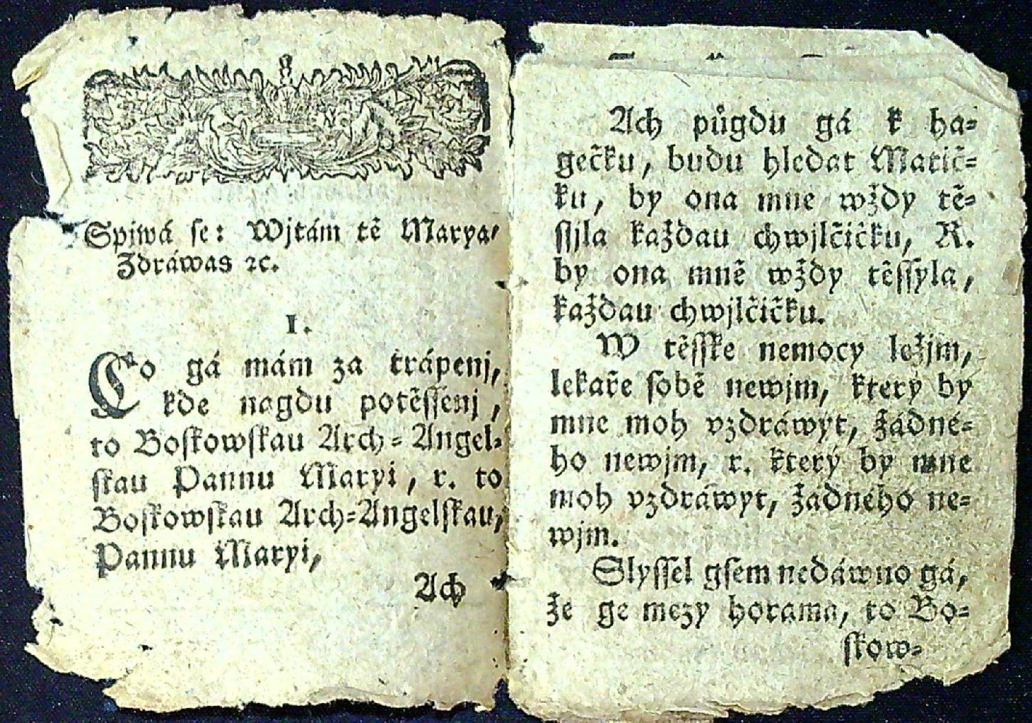 Tištěno švabachem, stránkové kustody, na tit. listu v prolamovaném rámečku dřevoryt Panny Marie Boskovské (45 x 40 mm), v záhlaví první strany textu dřevořezový vlys, vstupní iniciála zalomená do výše 2 řádků. - Papír zahnědlý a při okrajích potrhaný. Zakoupeno ze sbírky významného sběratele Rudolfa Hlavy ze Semil.