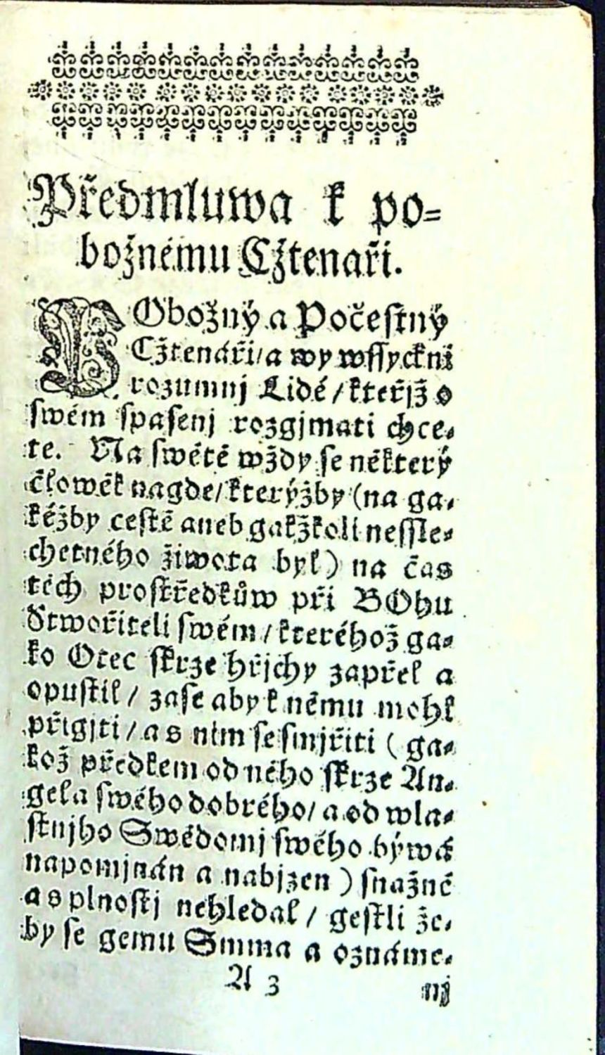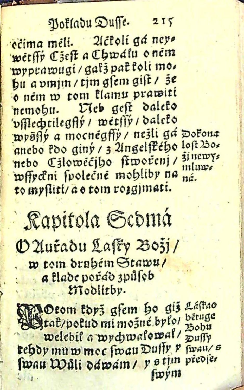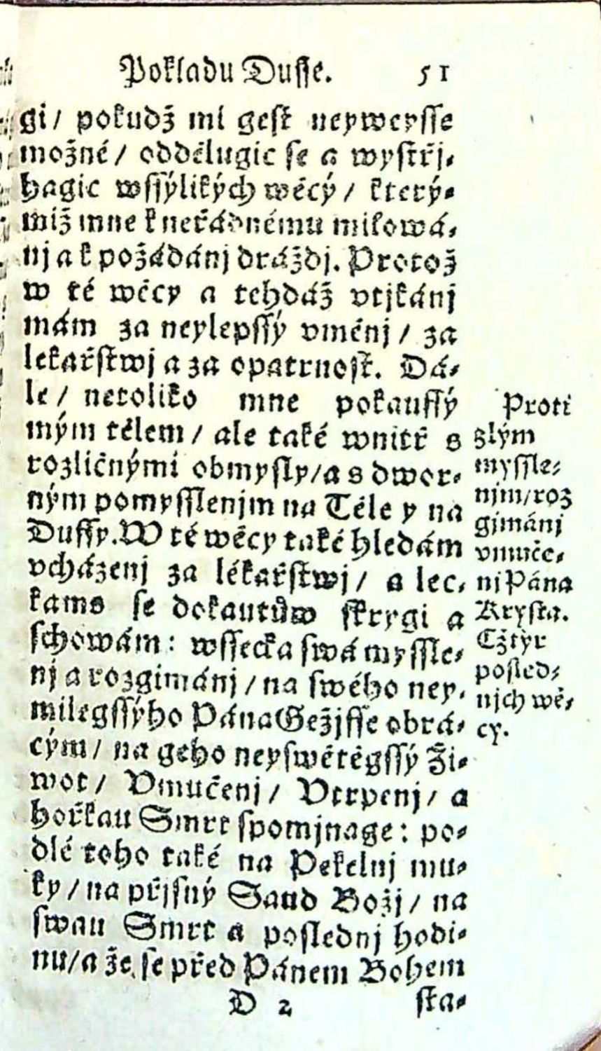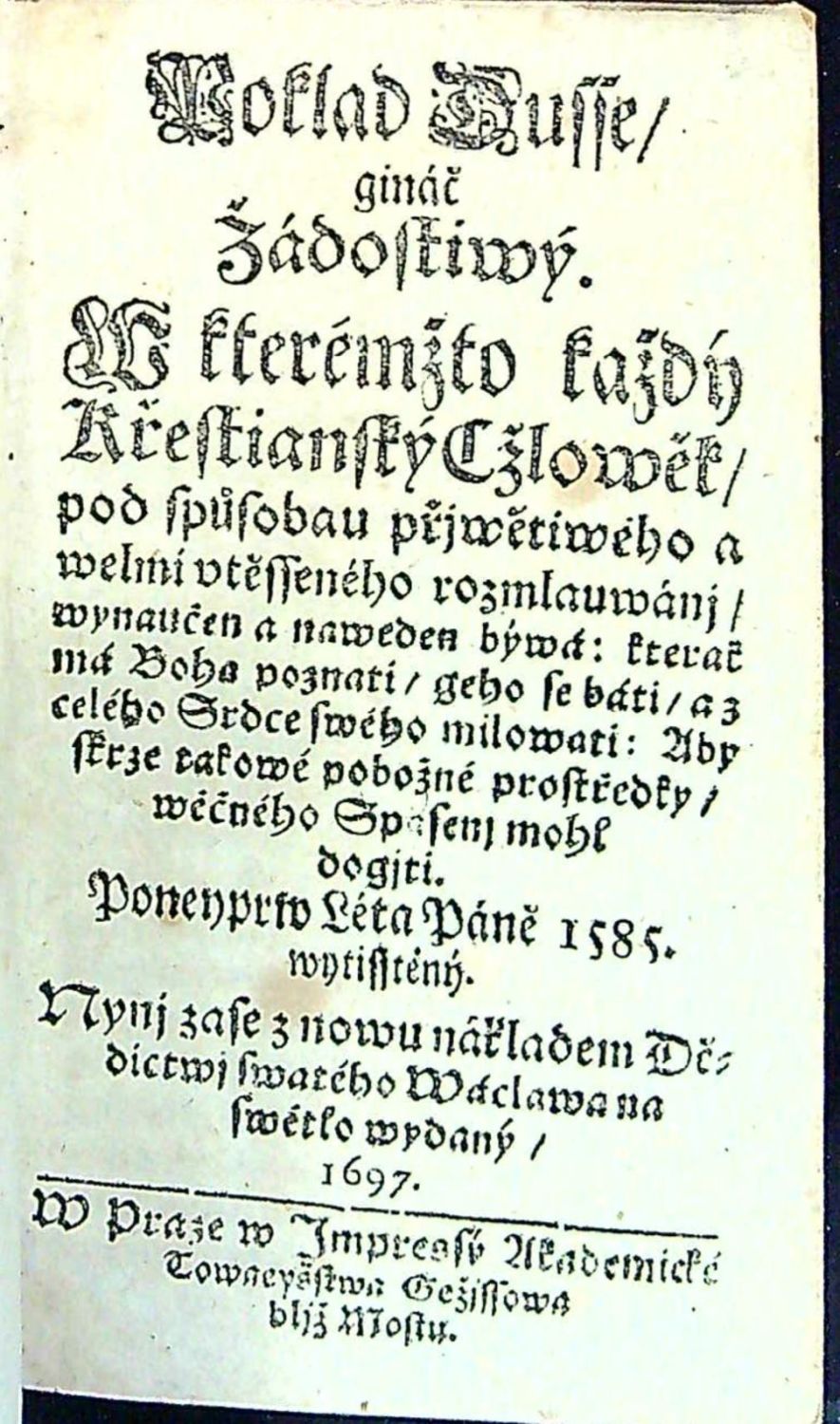 Poklad Dusse/ gináč Žádostiwý. W kterémžto každý Křestianský Cžlowěk/ pod spůsobau přjwětiwého a welmi vtěsseného rozmlauwánj/ wynaučen a naweden býwá: kterak má Boha poznati/ geho se báti/ a z celého Srdce swého milowati: Aby skrze takowé pobožné prostředky/ wěčného Spasenj mohl dogjti. Poneyprw Léta Páně 1585 wytisstěný. Nynj zase znowu nákladem Dědictwj swatého Wáclawa na swětlo wydaný.