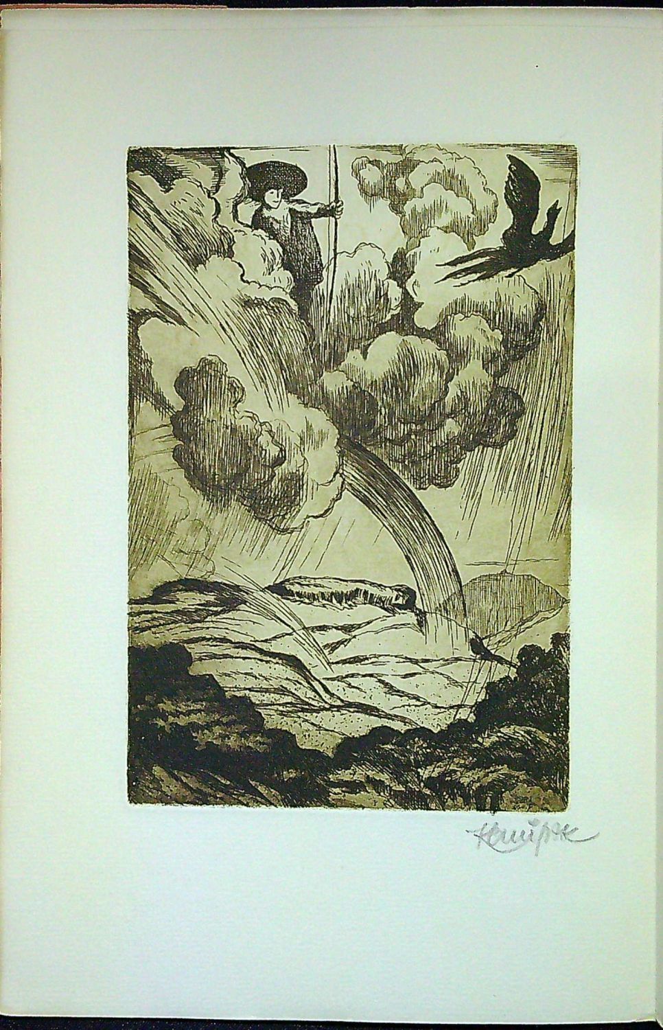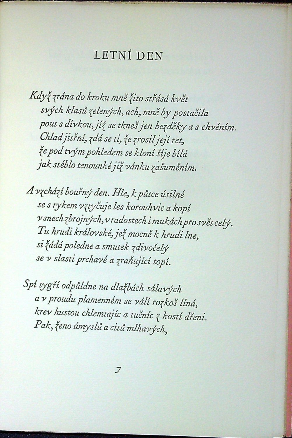 Ex. č. 133 z 230 výtisků tištěných na holandském ručním papíře van Gelder. Leptem, kresbou v tit. listu a nakl. značkou vyzdobil Jan Konůpek. Na přední straně obálky tlačená Konůpkova ilustrace. Obálka lehce zaprášená a při horním okraji přední strany mírně natržená.