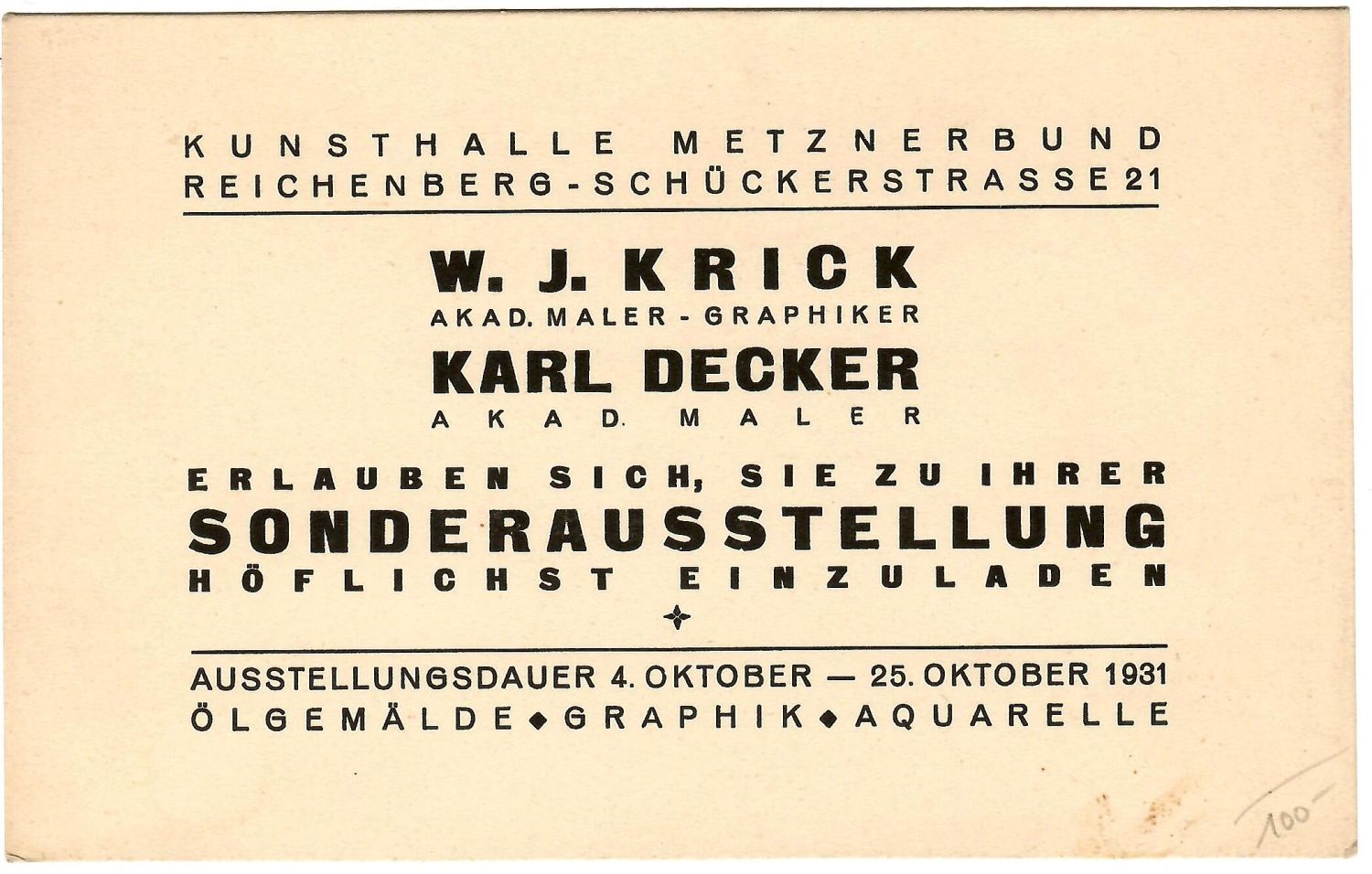 Výstava proběhla ve dnech 9. - 27. listopadu za účasti Alfreda Kunfta, Erwina Müllera, Hans Thumy, Rudolfa Karaska, Alfreda Dorna, Karla Kaschaka a Richarda Flessnera. (Uvnitř dvoulisty je uveden seznam všech šedesáti vystavených prací. Přiložen výstřižek z dobových českých novin s recenzí F. Janouška na výstavu. + pozvánka na výstavu W. J. Kricka a Karl Deckera, která se konala v Liberci od 4. 10. do 25. 10. 1931 v Kunsthalle Metznerbund v Liberci.