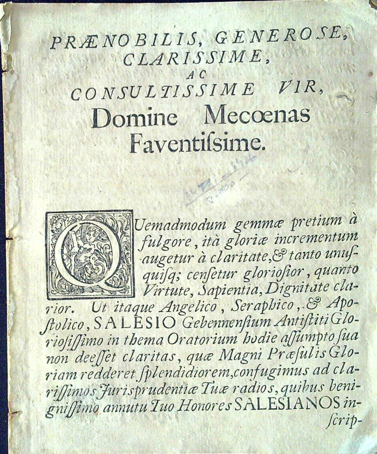 PRAENOBILIS, GENEROSE, CLARISSIME, AC CONSULTISSIME VIR, Domine Mecoenas Faventissime.