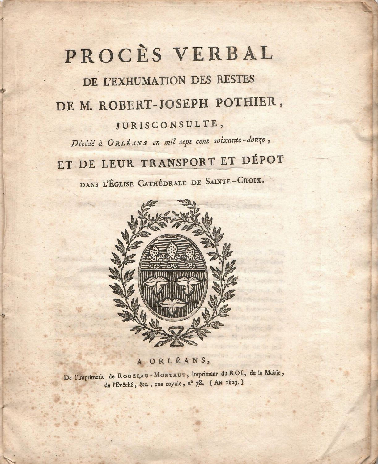 PROCES VERBAL DE L´EXHUMATION DES RESTES DE M. ROBERT-JOSEPH POTHIER, JURISCONSULTE, Décédé á Orléans en mil sept cent soixante-douze, ET DE LEUR TRANSPORT ET DÉPOT dans l´Ěglise Cathédrale de Sainte-Croix.