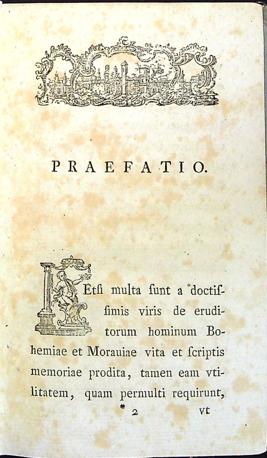 Latinský text a česká slova antikvou, řecká alfabetou, signatury, stránkové kustody, arabské číslování stran při horním vnějším okraji, živá záhlaví, poznámky pod čarou, vstupní viněta s pohledem na opevněné město olemovaná barokní kartuší, za předmluvou další dvě viněty, koncová viněta.