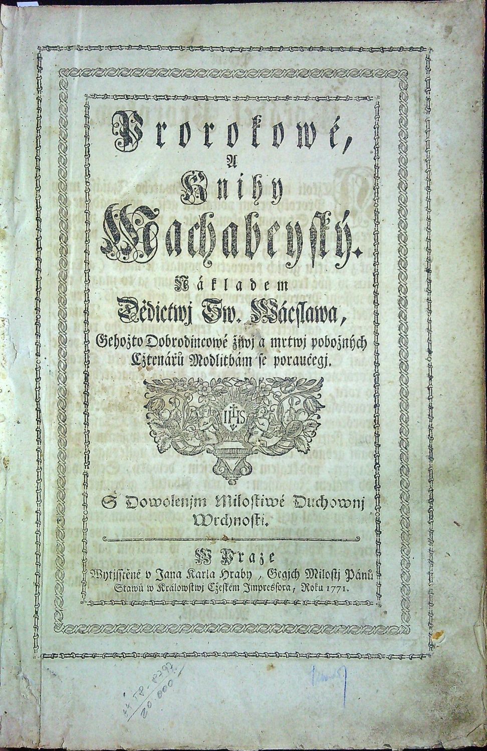 Prorokowé A Knihy Machabeyský. Nákladem Dědictwj Sw. Wáclawa ,Gehožto Dobrodincowé žiwj a mrtwj pobožných Cžtenářů Modlitbám se poraučegj. ... + Druhý djl Biblj totižto Nowý Zákon Podlé starého obecného Latinského textu ...