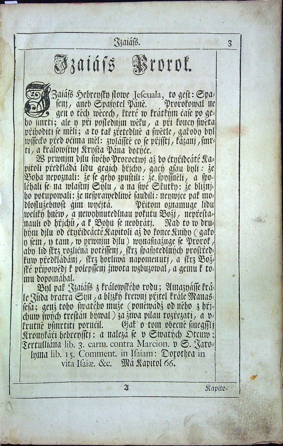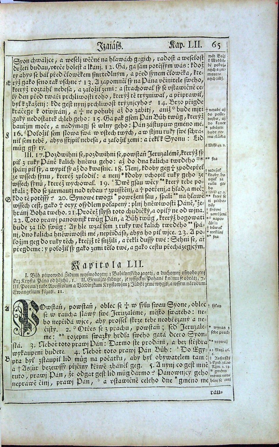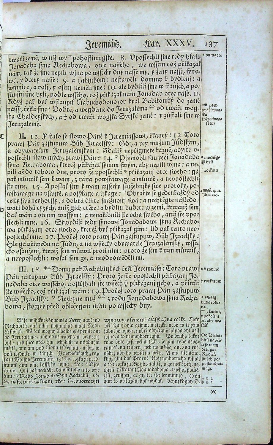 Český text švabachem, latinská slova antikvou, arabské číslování stran ve vnějších horních rozích, strany ve zdvojených rámcích z jednoduchých linek, při vnějším okraji v rámci tištěné marginálie (konkordance a odkazy na prameny), živá záhlaví, pod textem kapitol dvousloupcový výklad sv. Otců nebo vydavatelů Bible, signatury, stránkové kustody. - Chybí I. díl, první část SZ.