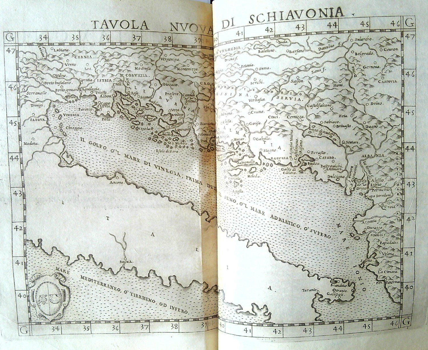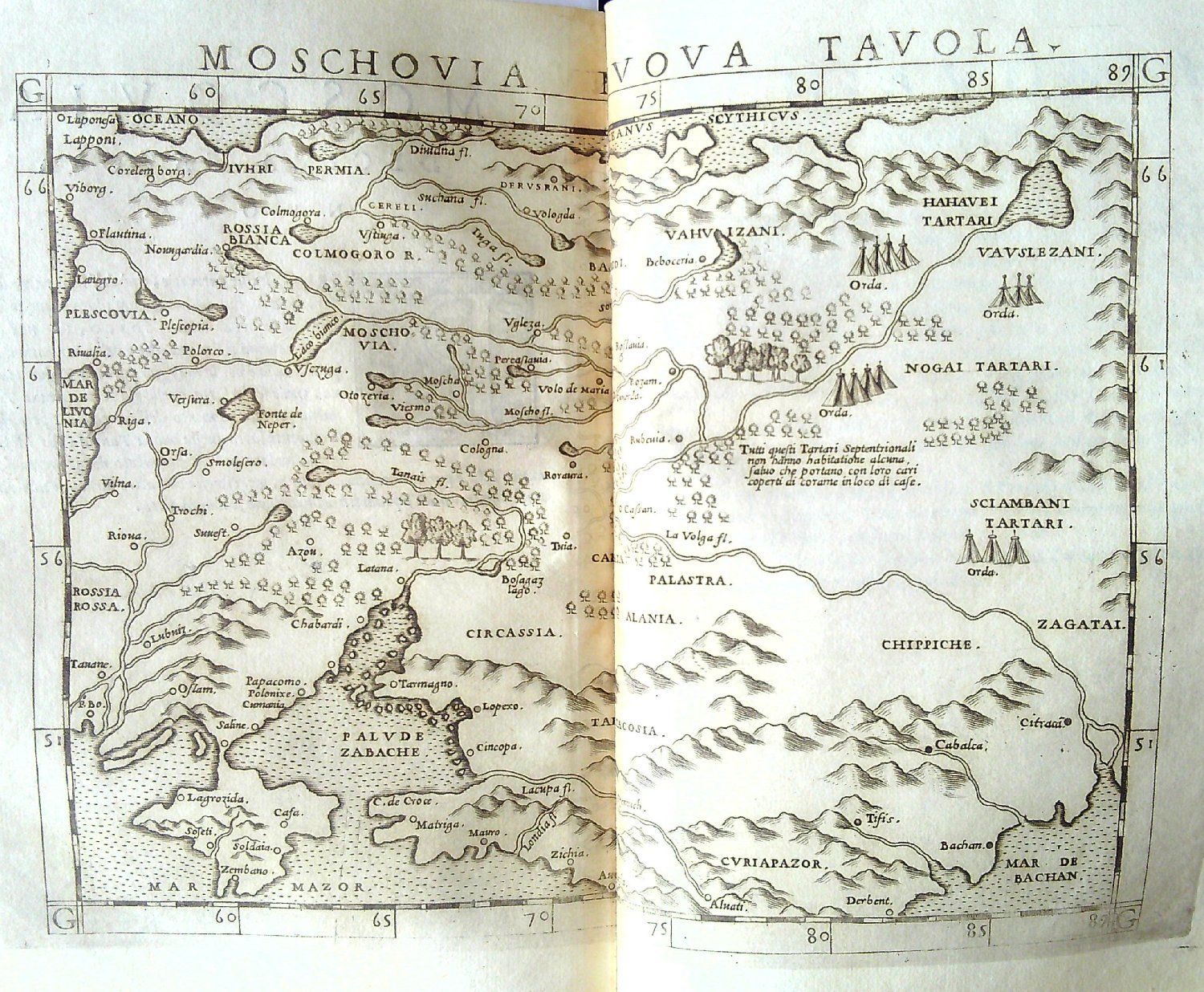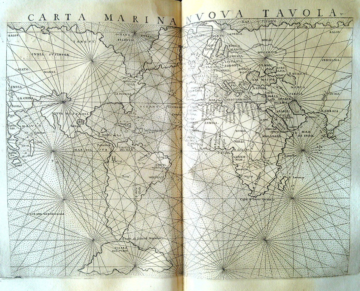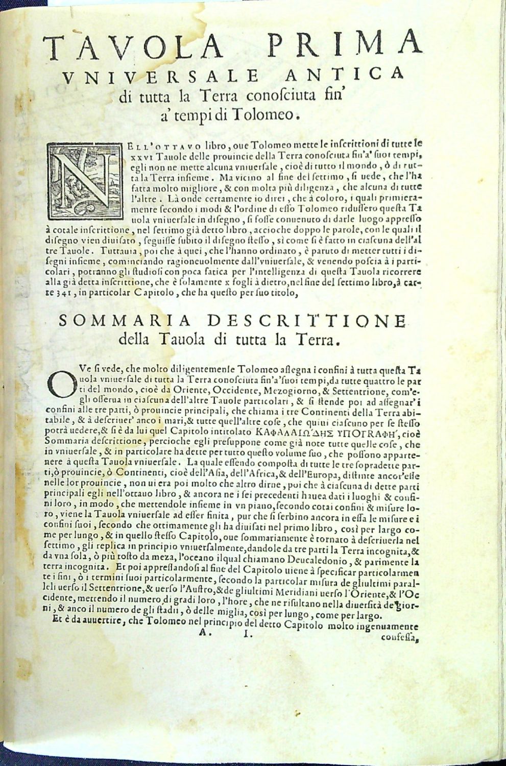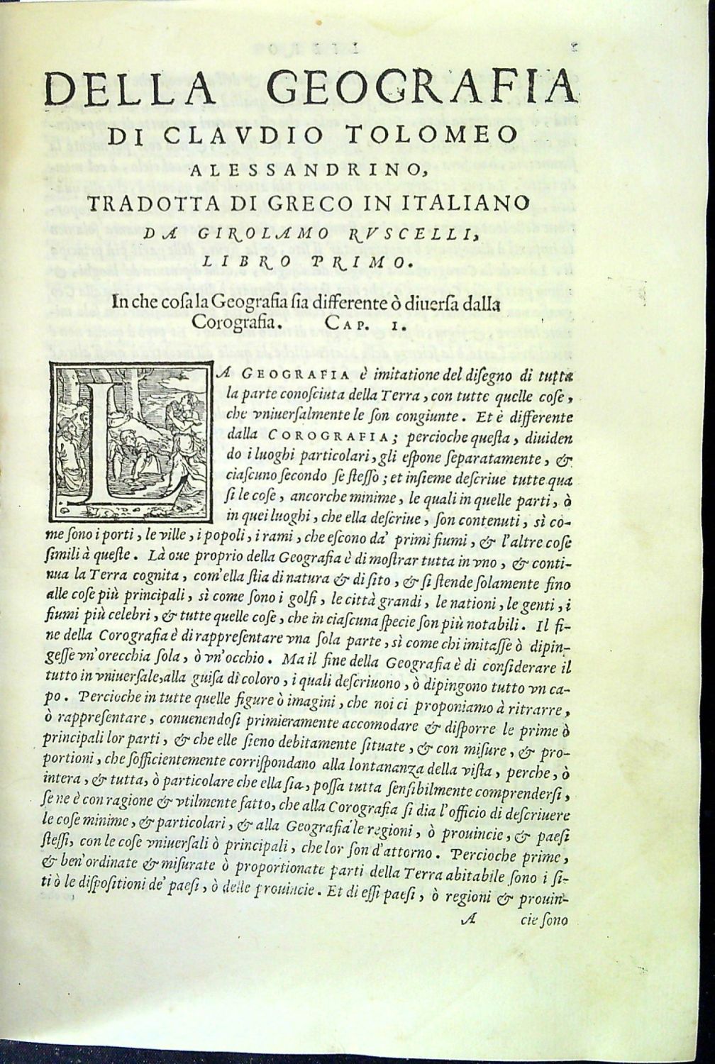 LA GEOGRAPHIA DI CLAUDIO TOLOMEO ALESSANDRINO, Nuouamente tradotta di Greco in Italiano, DA GIROLAMO RUSCELLI, Con Espositioni del medesimo, particolari di luogo, & universali sopra tutto il libro, et sopra tutta la Geografia, o modo di far la descrittione di tutto il mondo. Et con nuoue et bellissime figure in istampe di rame, oue, oltre alle XXVI antiche di Tolomeo, se ne son´aggiunte XXXVI altre delle moderne. Con la carta da nauicare, et colmodo d´intenderla, et d´adoperarla. Aggiuntoui un pieno discorso di M. GIOSEPPE Moleto Matematico. Nel quale si dichiarano tutti i termini & le regole appartenenti alla Geografia. Et con una nuova et copiosa Tavola di nomi antichi, dichiarati co i nomi moderni, et con molte altre cose utilissime et necessarie leggendo potra conoscere. et