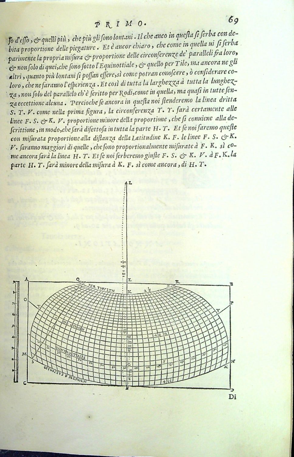 Kniha se skládá ze 3. částí se samostatnými titulními listy (2. část s tit. listem "ESPOSITIONI ET INTRODUTTIONI UNIVERSALI. DI GIROLAMO RUSCELI sopra tutta la Geografia di Tolomeo", 3. část: "DISCORSO UNIVERSALE DI M. GIOSEPPE MOLETO MATEMATICO. Al Signor Federigo Morando, Nel quale son raccolti, et dichiarati tutti i termini, et tutte le regole appartenenti alla Geografia"). Na tit. listech a v závěru II. dílu tiskařovy signety, živá záhlaví, konturové iniciály ve dvojitém jednoduchém rámečku na ilustrativním pozadí zalomené do výše 6-12 řádků, tučně tištěné versálky ve výši 3 řádků. V textu dřevořezové ilustrace s vyobrazením diagramů, měřícího přístroje, astrolábu....Za textem prvního dílu 26 mědirytinových map přes dvě strany dle Ptolemaia, za textem druhé části 31 (z 36) dobových map přes dvě strany, které sestavil Giacomo Gastaldi. Mezi Ptolemaiovými mapami je mapa tehdy známého světa, mapy Evropy, Asie a Afriky; mezi novějšími mapami také mapy Jižní Ameriky, Brazílie, Mexika, Barbadosu, Kuby a mapa námořní (navigační).