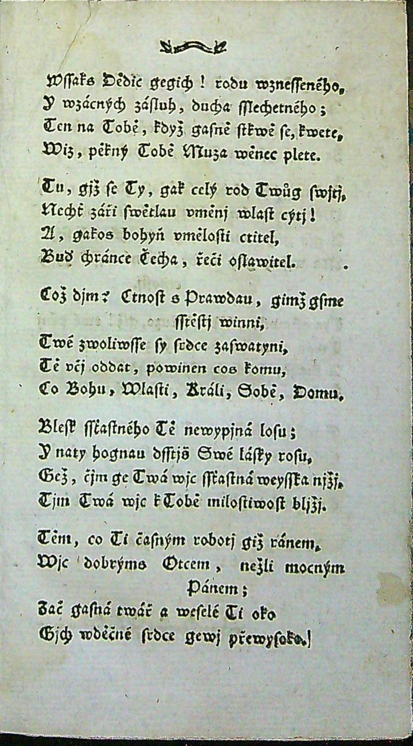 Tištěno švabachem, Nové básně s titulním listem tištěným na rýhovaném papíře s vinětou a údajem o připojeném "Chrámu ..." (SKC neeviduje stejný titulní list, - odlišné viněty a bez uvedení druhého titulu). V první části uprostřed horního okraje stran mizící ozdobná vlnovka. Na titulním listu přídavku dřevorytová viněta. (Přídavek báseň od Ch. L. von Montesquieu přeložená Puchmayerem).