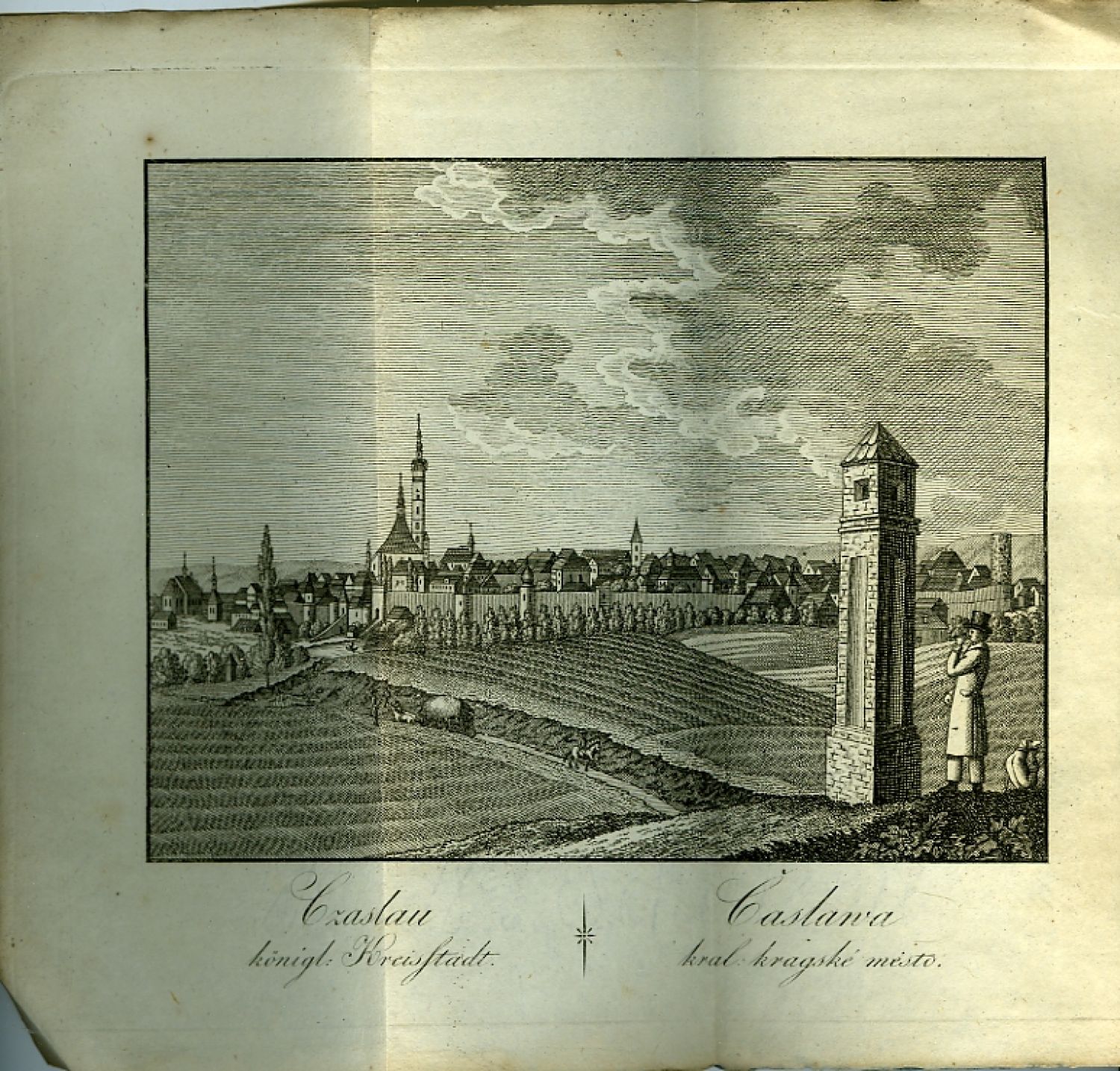 Německý text a názvy obcí v českém jazyce tištěny gotikou, ve front. rozkládací mědirytina s pohledem na město Čáslav. - Původní papírová obálka ve hřbetu prasklá, při spodním okraji přes hřbet přelepen pap. knihovnický štítek, oslí uši.