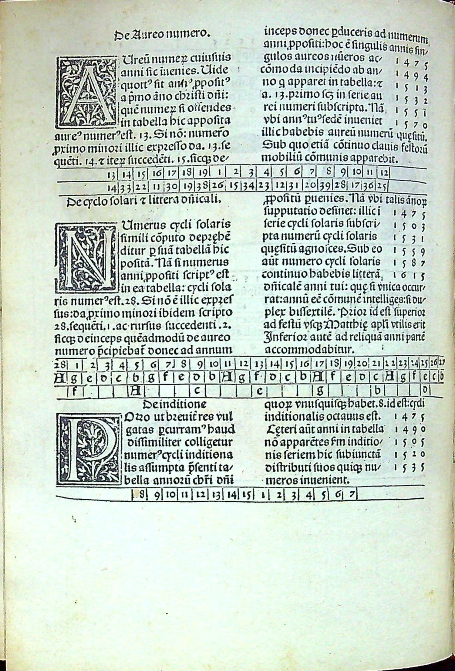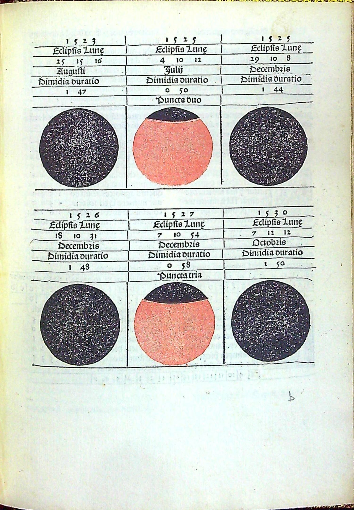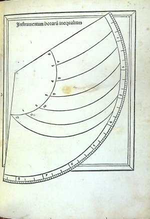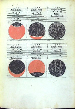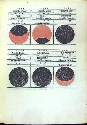 Červeno-černý tisk rotundou, titulní list v dřevorytové borduře zdobené ornamentem, konturové iniciály na ornamentálním pozadí zalomené do výše 6 řádků, na tit. listu do výše 12 řádků. Na foliích b4 verso až b8 recto dvoubarevně tištěné vyobrazení zatmění měsíce a slunce od roku 1483 do roku 1530, astronomické tabulky. Na rubu titulním listu a jeho rubu tištěný pozdrav Regiomontanovi od Johannese Lucilia Santrittera, který zřejmě provedl i redakci vydání kaledáře. K vydání připravil Jacobus Sentinus. Na foliích c8-c12 4 celostr. dřevoryty v jednoduchém rámu s geometrickými vyobrazeními.
