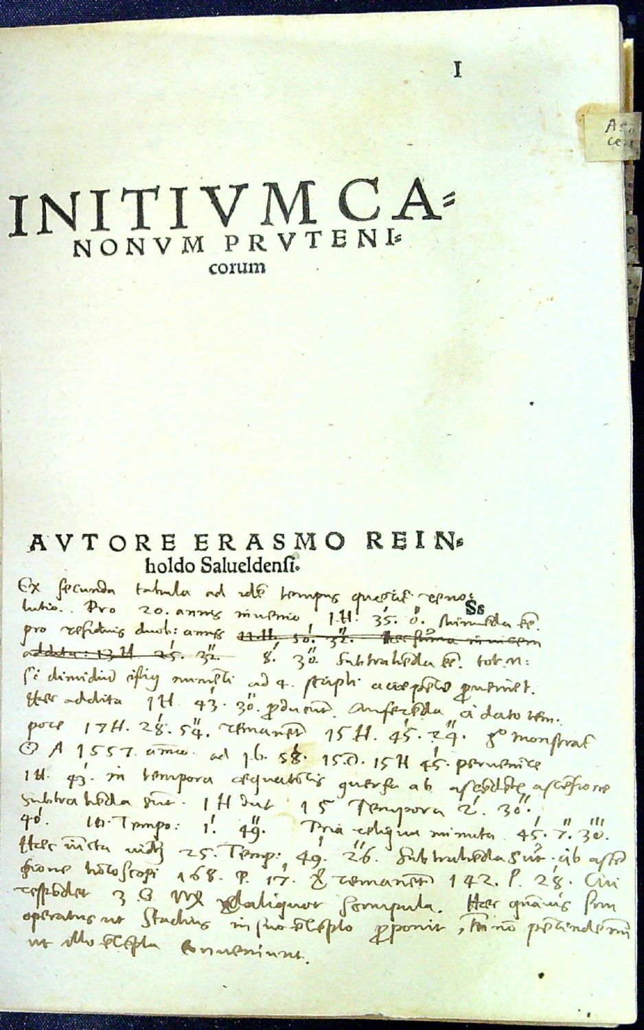Erasmus Reinhold (22.10. 1511 Saalfeld - 19.2. 1553 Saalfeld), byl německý astronom a matematik považovaný za nejvlivnějšího astronomického pedagoga své generace. Roku 1536 byl jmenován profesorem vyšší matematiky na universitě ve Wittenbergu, kde později také působil ve funkci rektora. - Nabízená kniha je v Čechách a na Moravě pouze v jediném exempláři v NK ČR v Praze. který pochází z osobní knihovny Tychona de Brahe.