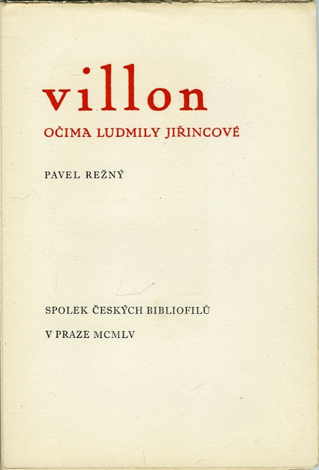 Vyšlo jako příloha Zpráv SČB v Praze č. 6/1955 za účasti SČUG Hollar. Uspořádal Kamill Resler, typograf. upravil Josef Hrachovina, vytiskly Pražské tiskárny v počtu 400 výt. Obsahuje soupis Villonovských děl L. Jiřincové. - Knižní blok při vnějším horním okraji i horní rohy obálky mírně pomačkané.
