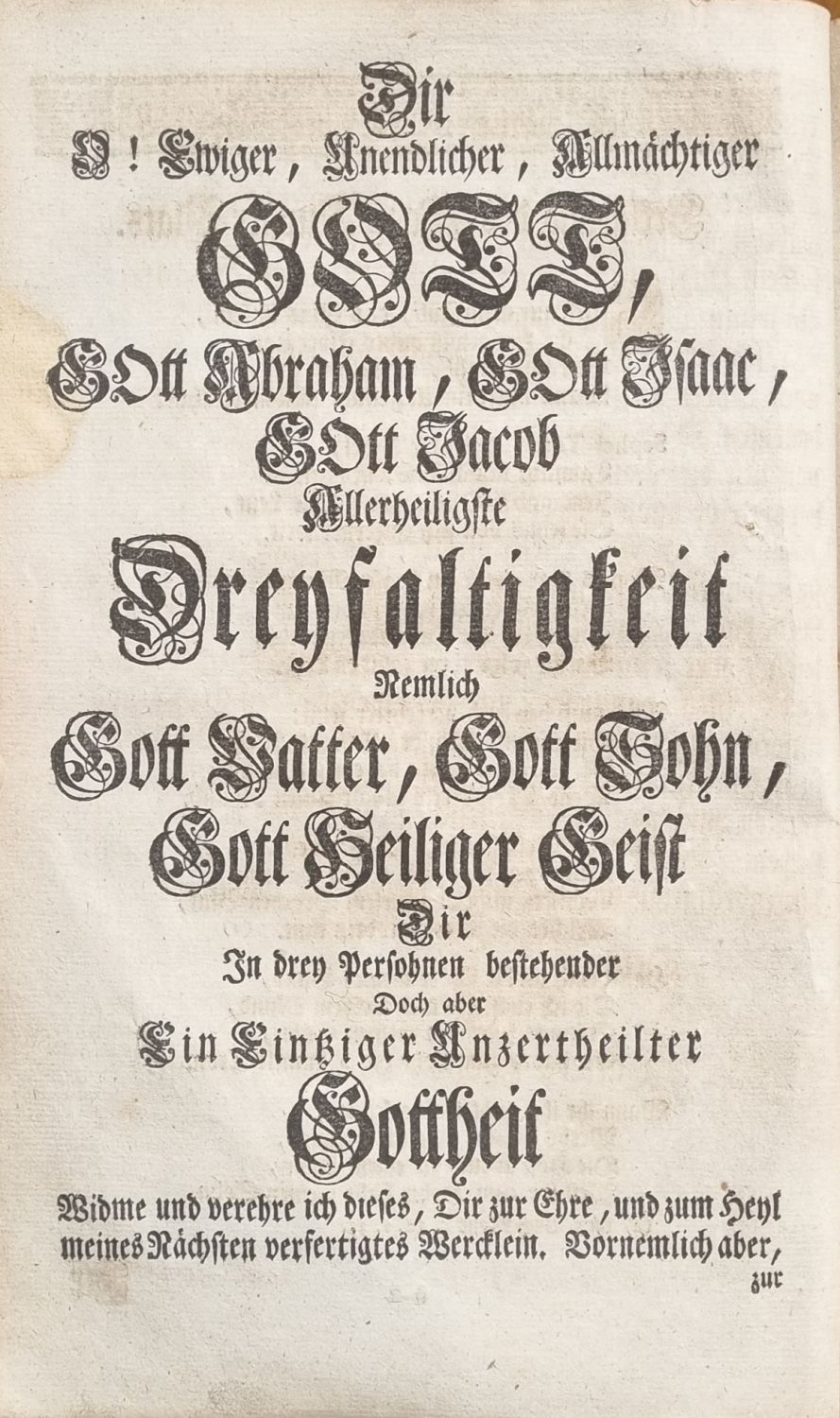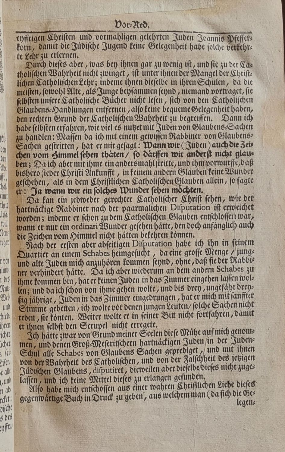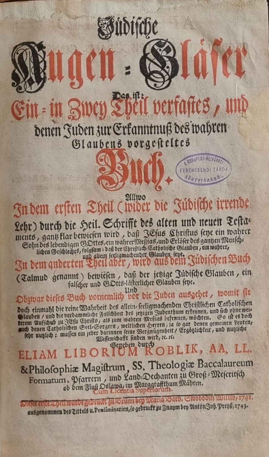 Jüdische Augen = Gläser Das ist: Ein = in Zwey Theil verfastes, und denen Juden zur Erkanntnuß des wahren Glaubens vorgesteltes Buch. Allwo In dem ersten Theil (wider die Jüdische irrende Lehr) durch die heil. Schrifft des alten und neuen Testament, gantz klar beweisen wird, daß JEsus Christus seye ein wahrer Sohn des lebendigen GOttes, ein wahrer Meszias, und Erläser des gantzen Menschlichen Geschlechts, folgsam: daß der Christlich=Catholische Glauben, ein wahrer, und allein seeligmachender Glauben seye. In dem anderten Theil aber, wird aus dem Jüdischen Buch (Talmud gennant) beweisen, daß der jetzige Jüdische Glauben, ein falscher und GOttesĺ=lästerlicher Glauben seye. Und Obzwar dieses Buch vornemlich vor die Juden ausgebet, womit sie doch einmahl die reine Wahrheit des allein=seeligmachenden Christlichen Catholischen Glauben/ und die verdammliche Falschheit des jetzigen Judenthum erkennen, und sich ohne weiterem Aufschub zu JEsu Christo, als zum wahren Meszias bekennen, möchten. So