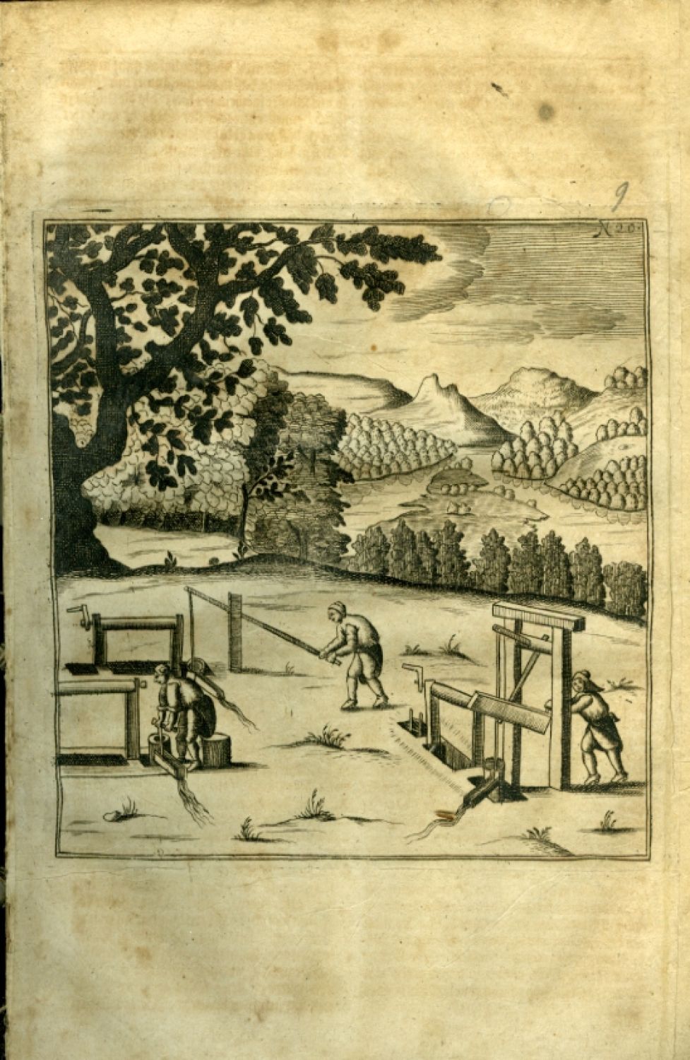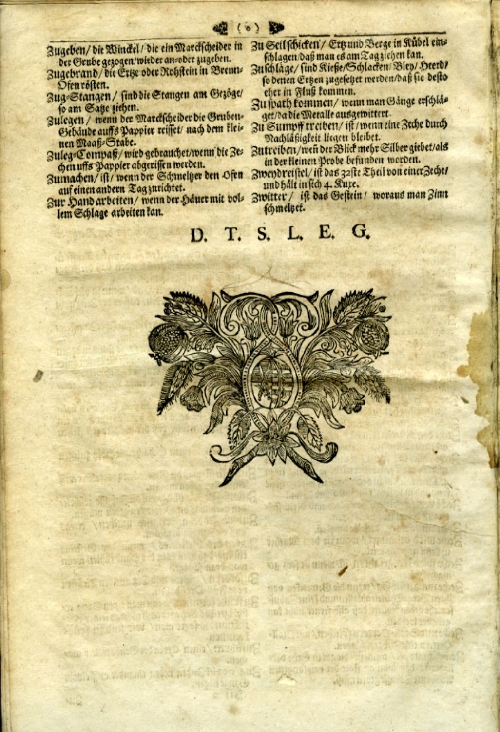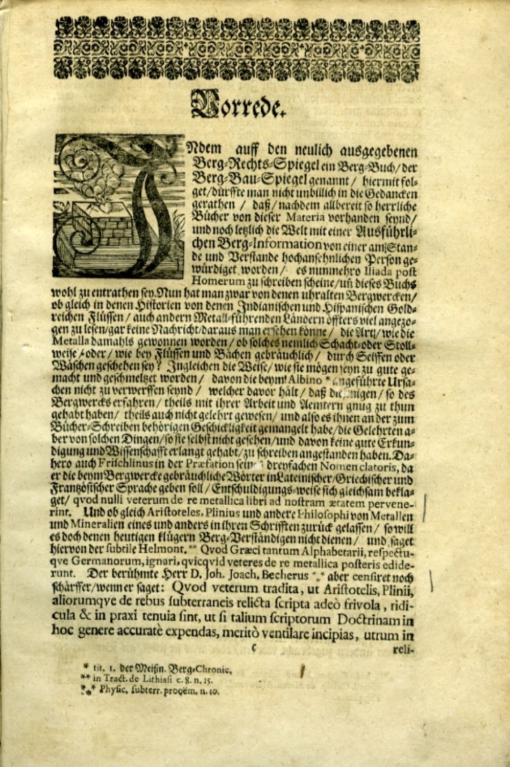 SPECULUM METALLURGIAE POLITISSIMUM. Oder: Hell=polierter Berg=Bau=Spiegel/ Darinnen zu befinden: Wie man [B]ergwerck suchen/ ausschürffen/ mit Nutzen bauen/ allenthalben wo[hl] anstellen/ befördern/ dabey alles Gestein und Ertze gewinnen/ fördern/ rösten/ schmelzen und zu gut machen/ [...] Allen Berg=Bau=liebenden/ sie kommen in=oder nicht in die Grube/ item, Grund=Herren/ Gewercken/ Berg=Amtleuten/ Berg= und Hütten=Vorsteher/ Dienern und Arbeitern zu Nutz und Unterricht/ und dem Edlen Bergwerck zum besten/ mit allen dessen Begebenheiten und Brauchbarkeiten/ aus eigner Erfahrung/ als einer darzu gebohrnen Berg=Wurtzel/ beschrieben/ von [...] Churfl. Sächs. gewesenen Berg=Meistern/ Stolln=Factorn und Marckscheidern in Druck gegeben/ und mit Kupffern geziret/ durch dessen Enckel Johann Christoph Goldbergen/ h. t. Königl. Pohln. und Churfl. Sächs. Berg=Meistern [...]
