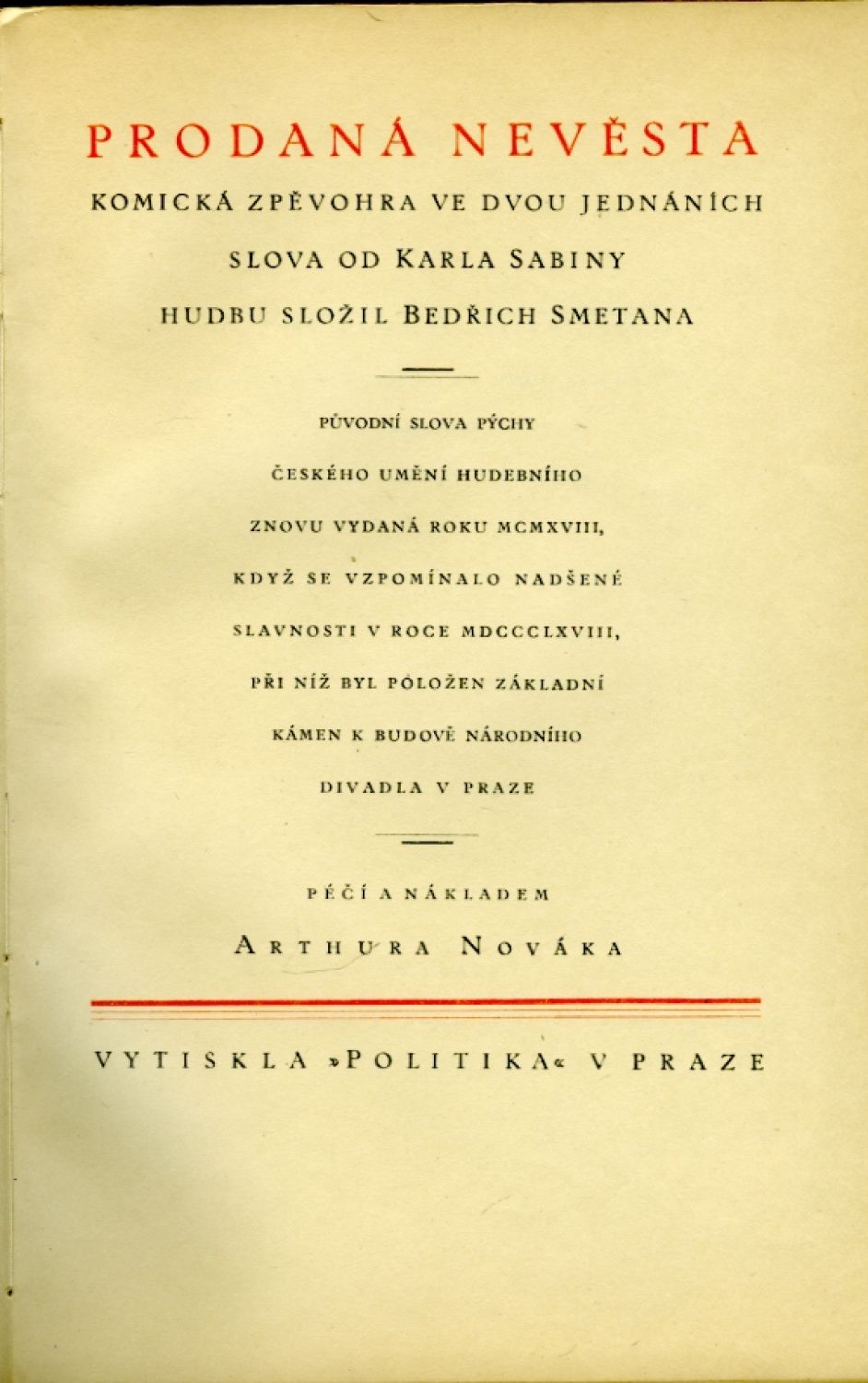 Prodaná nevěsta. Komická zpěvohra ve dvou jednáních. Slova od ... Hudbu složil Bedřich Smetana. Původní slova pýchy českého umění hudebního znovu vydaná roku MCMXVIII, když se vzpomínalo nadšené slavnosti v roce MDCCCLXVIII, při níž byl položen základní kámen k budově Národního divadla v Praze.
